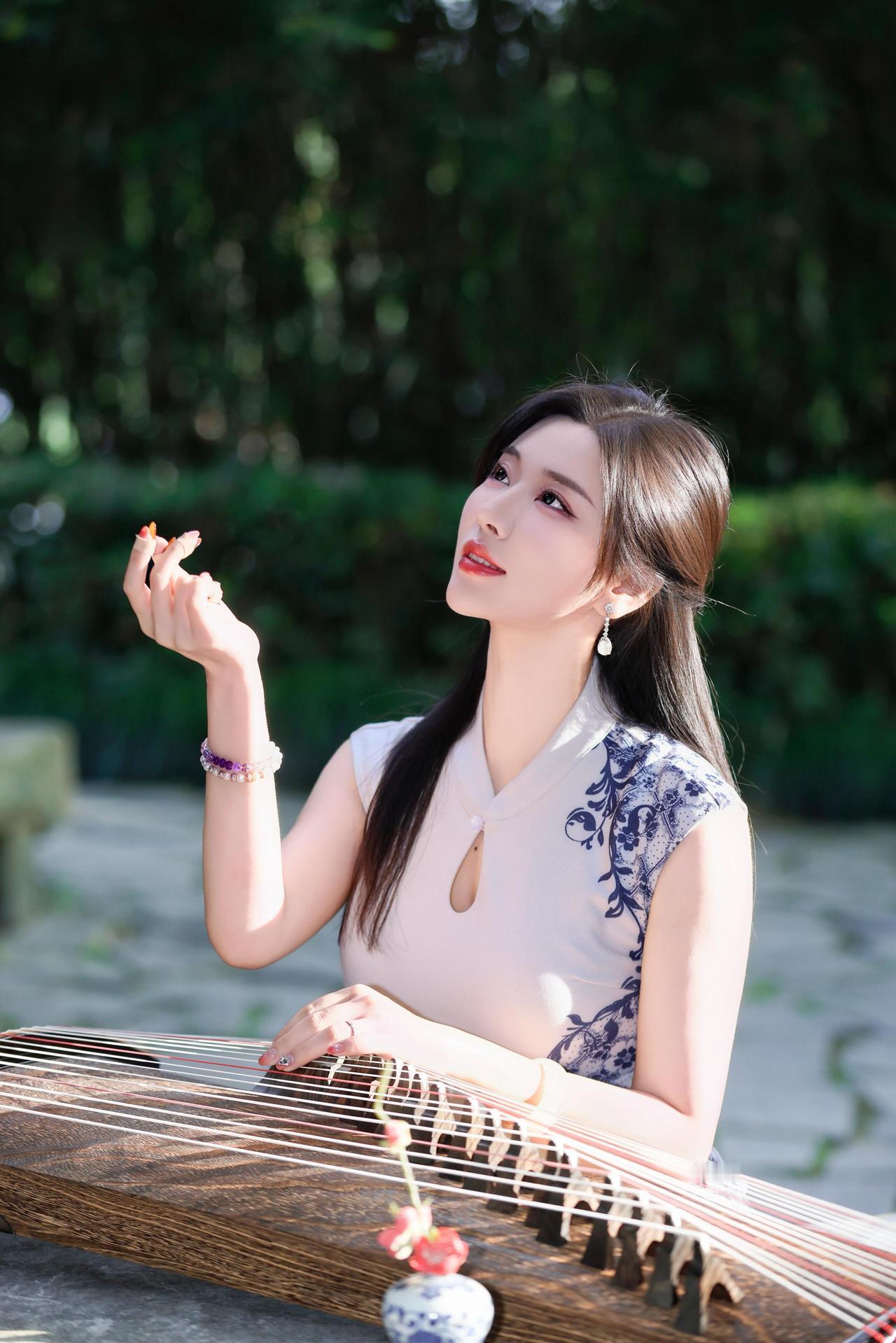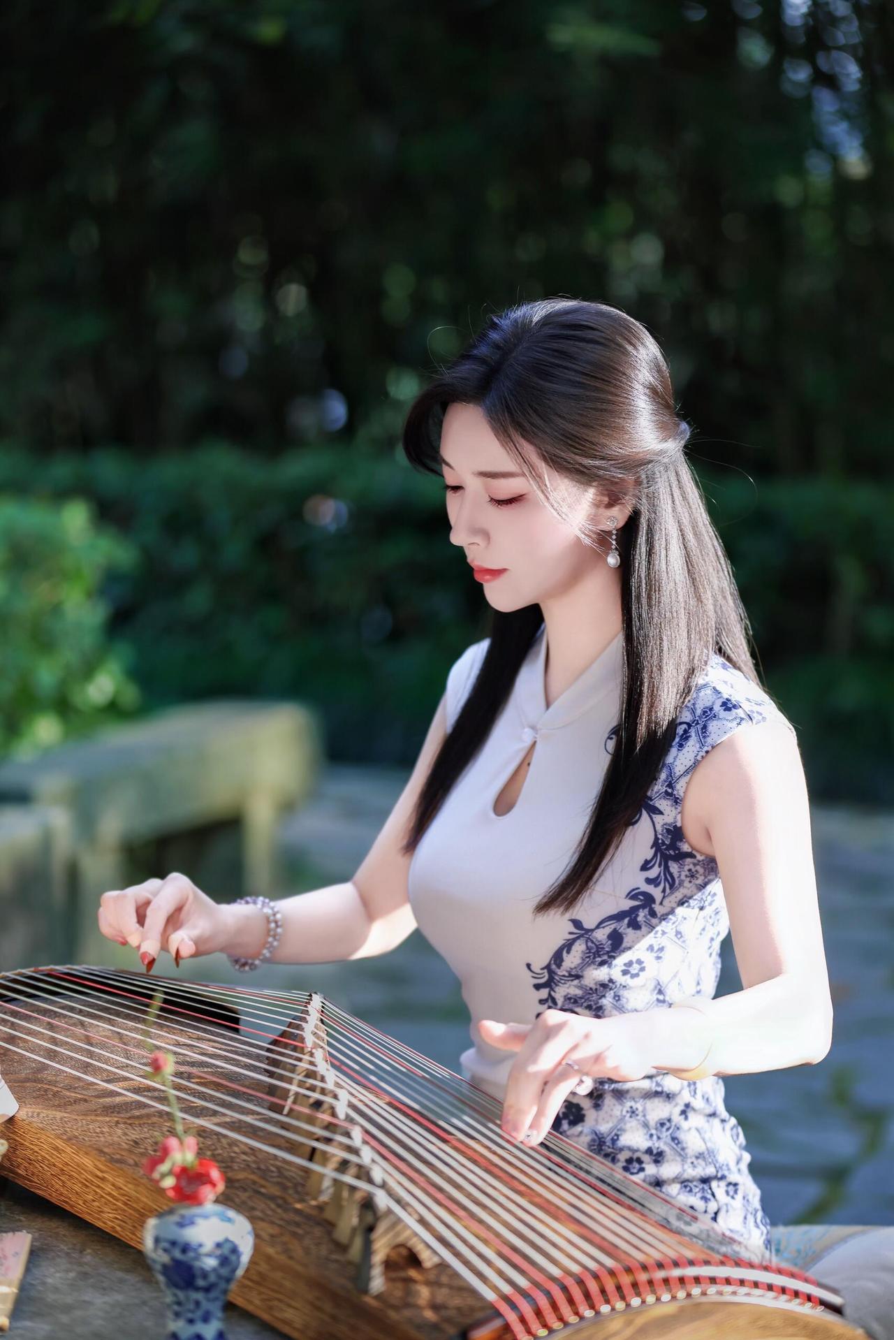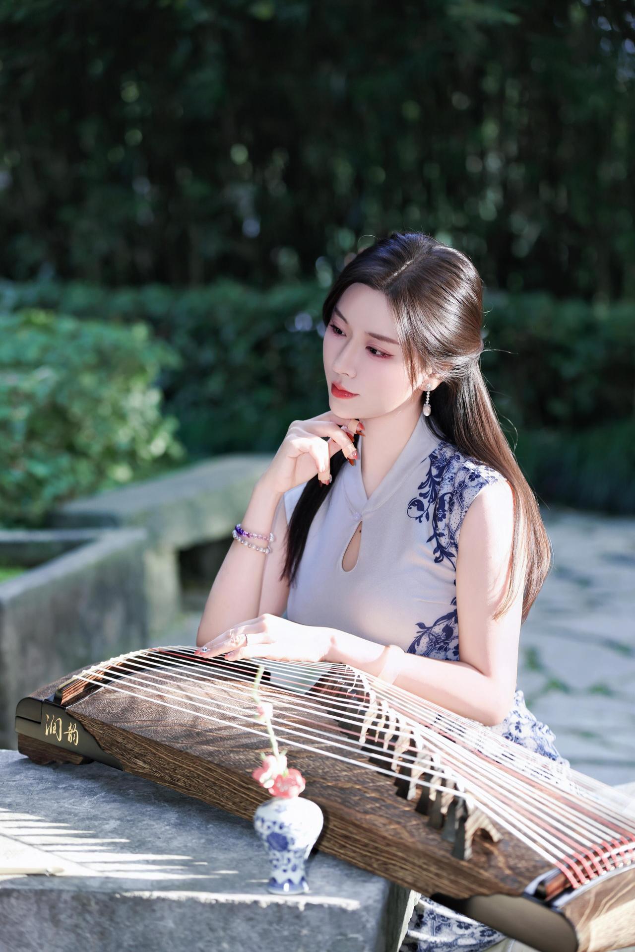 竹影浸在风里,指尖落向琴弦时,瓷青纹样正顺着旗袍漫成一弯浅溪。 发梢坠着碎光,