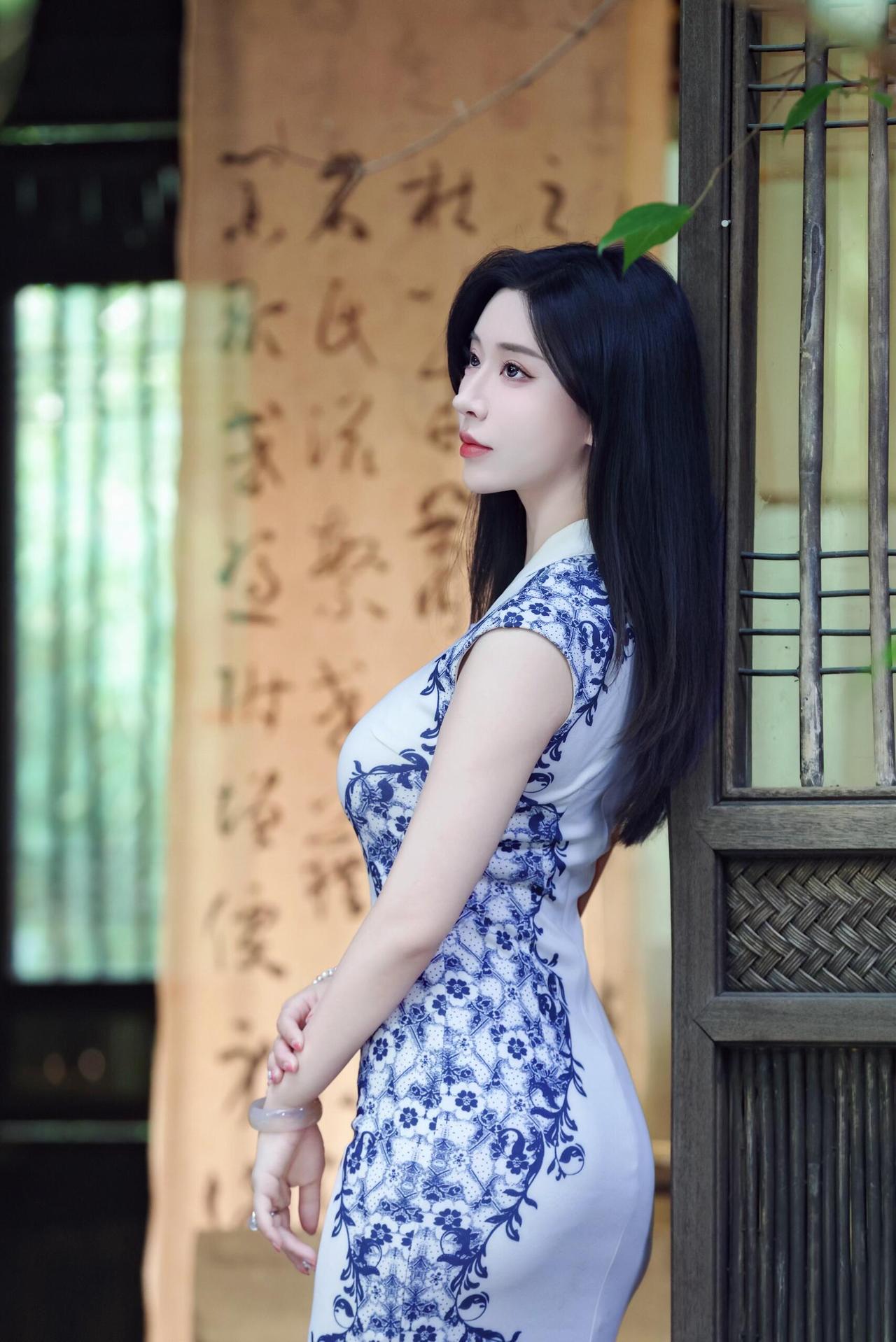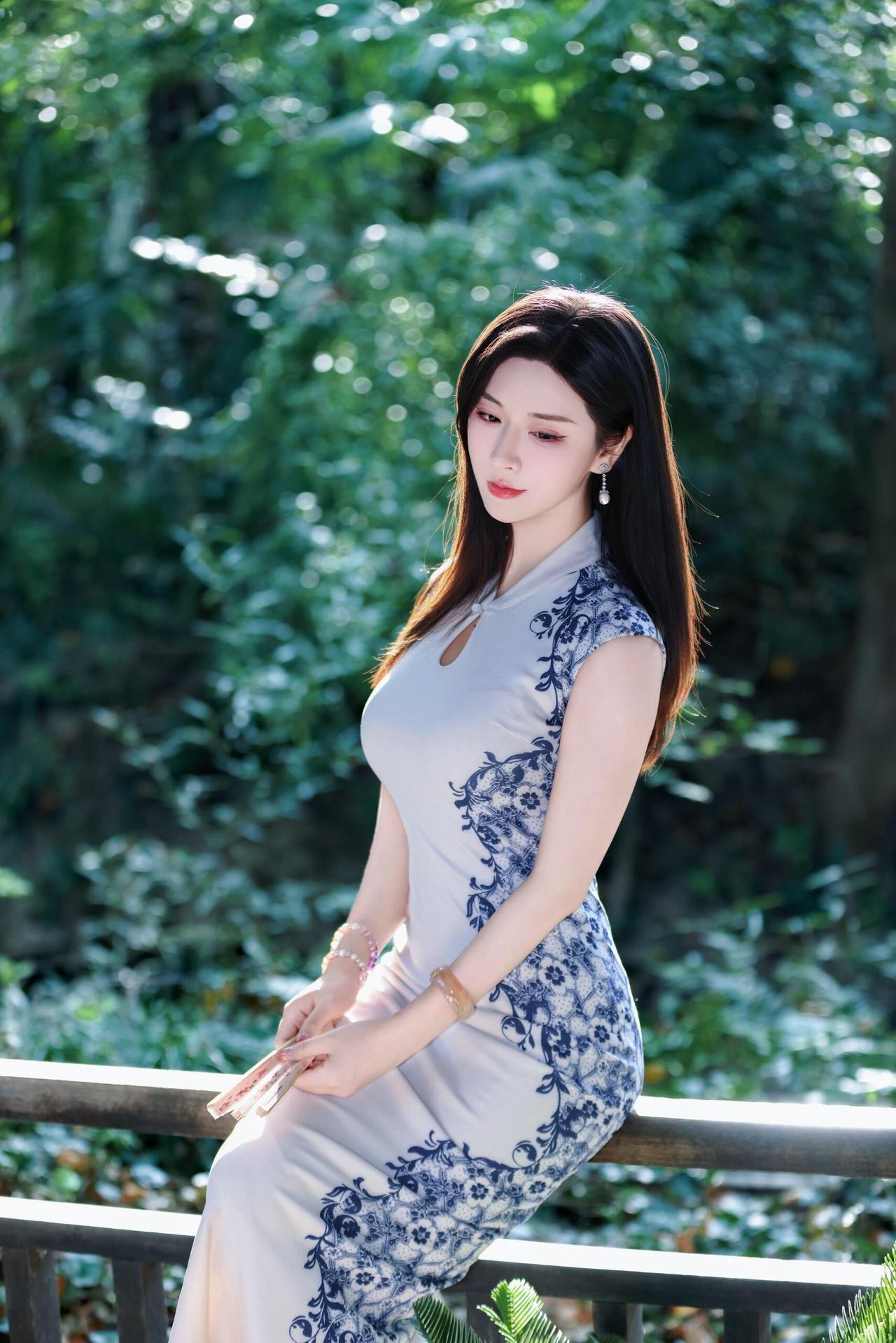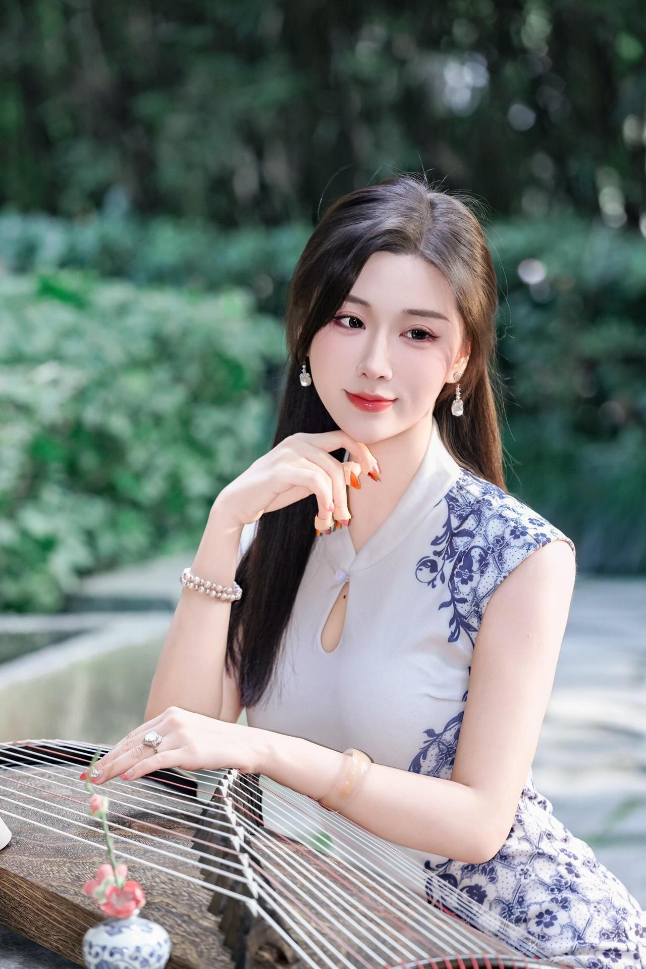 竹影浸在风里,指尖落向琴弦时,瓷青纹样正顺着旗袍漫成一弯浅溪。 发梢坠着碎光,耳坠轻晃如露。抬眼是云栖在叶隙,垂眸见案头小瓶里,梅枝斜斜挑着半盏春。 扇沿蹭过腕间的凉,书页裹着墨香漫开——原来日子不必太满,有琴音、有疏影,有这一身青花裁就的闲,便够把时光,酿成浅淡的甜。 = = = = = = = = = = = = = = = = = = = = = 青花旗袍摄影思路|把东方韵锁进镜头里 1. 场景:选竹林/古院,用斑驳光影柔化背景,突出旗袍瓷纹; 2. 道具:古筝+青花小瓶,借器物衬国风质感; 3. 神态:引导轻垂眸/抬眼望叶,捕捉松弛的温婉感; 4. 色调:后期压暗背景,提亮旗袍浅底色,让青花更清透。