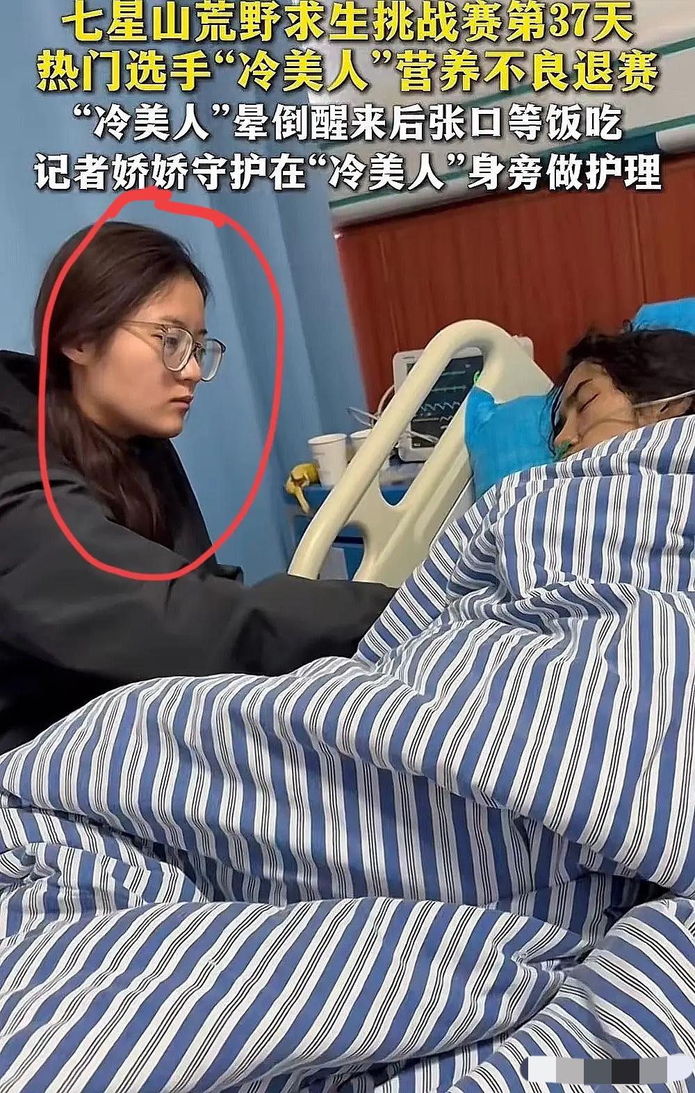 冷美人被抬下山强制退赛, 谁能想到照顾她的居然是记者娇娇! 没有扛话筒、戴着大眼镜的娇娇,守在床边忙前忙后,一看就是火急火燎赶来帮忙的,完全没了镜头前的采访状态。 其实看直播就知道这姑娘不一般,采访接地气不冷场,跟选手聊得有来有回,关键是不捧高踩低,对每位选手都真心热情。 连老六都喊着是她粉丝,说进决赛要给她盖好房子,被她采访过的选手估计没谁不喜欢吧? 比起流量至上的套路,这种发自内心的真诚才最打动人。 退赛虽可惜,但有这么细腻的人陪着,冷美人肯定能快点好起来,大家还等着看她个人直播呢!