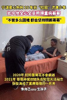 2009年,宁波一个18岁的小伙子走投无路,在公园长椅上睡了半个月,被一位陌生大妈发现,“跟我回家吧”…谁料,小伙子16年的报恩让人泪目! 2025 年宁波康复室,孙彬扶着扶手迈出第一步,张俊涛的手紧紧护在他腰侧。   “哥,成了!” 孙彬声音发颤,张俊涛笑着抹眼泪,这一步等了整整 4 年。   没人知道,支撑他们走到今天的,是 2009 年深秋那碗飘着葱花的热面条。   2009 年 11 月,宁波公园的长椅上,张俊涛的手冻得捏不住冷馒头。   18 岁的他从河南来宁波打工,刚下火车就丢了钱包,身份证和积蓄全没了。   工厂要身份证,他找不到活,只能在公园凑活,夜里裹着旧外套缩成一团。   那天他饿了两顿,啃着硬馒头时,一个穿棉袄的大妈停在他面前:“孩子,跟我走。” 这位大妈是董荷花,家里只有她和儿子孙彬,日子过得紧,却没让他再受冻。   董荷花把张俊涛带回家,第一件事就是煮面条,葱花飘在汤上,热气暖了他的手。   “慢点吃,不够锅里还有。” 董荷花坐在对面看着他,眼神像奶奶生前一样温柔。   孙彬下班回家,看见客厅多了个陌生人,皱着眉进了屋,没跟他说一句话。   张俊涛知道自己添麻烦了,第二天天没亮就起来拖地,把家里的碗全洗了。   董荷花看在眼里,悄悄跟孙彬说:“这孩子可怜,咱帮他一把,就像当年邻居帮咱。” 半个月后,董荷花带着张俊涛去派出所,跑了三趟才补好身份证。   她还凑钱给他买了件厚外套,孙彬把自己的旧自行车推给他:“上班骑这个方便。” 张俊涛在工厂找到活,第一个月发工资,就把大部分钱塞给董荷花:“干妈,生活费。” 董荷花不肯收,他硬塞到她手里:“您要是不收,我就搬出去住。” 孙彬看他实在,开始跟他说话,偶尔还会喊他 “哥”,让他尝尝自己带的零食。   2015 年,张俊涛在工厂升了组长,工资涨了,他第一件事就是给家里换冰箱。   董荷花总说 “浪费钱”,却在邻居面前夸他 “比亲儿子还贴心”。   孙彬找了对象,张俊涛帮着挑礼物,还跟他一起去见女方家长,替他撑腰。   有次董荷花感冒,张俊涛请假在家照顾,煮粥喂药,比孙彬还细心。   这年春节,他们拍了第一张全家福,张俊涛站在中间,笑得比谁都开心。   2019 年夏天,董荷花突然晕倒,医院说她是食道癌晚期,最多剩半年。   张俊涛正在外地出差,接到电话连夜赶回来,直接去了医院,没顾上换衣服。   他跟领导说 “我妈病了,得辞职”,领导劝他 “再想想”,他说 “妈比工作重要”。   从那天起,他在医院走廊铺了张折叠床,每天五点起来买早饭,帮董荷花擦身。   孙彬要上班,他就背着董荷花去做检查,160 斤的人压在他背上,腰累得直不起来。   董荷花走的前一天,攥着张俊涛的手说:“彬子身体不好,你多照顾他。” 张俊涛哭着点头:“妈,您放心,我一辈子都不会丢下他。” 2021 年,孙彬突然腿没力气,检查是肌肉萎缩,医生说可能会瘫痪。   孙彬把自己锁在屋里,写了遗书说 “不想拖累哥”,张俊涛发现后把遗书撕了。   “咱是兄弟,你瘫痪了我也照顾你,只要我在,就不会让你受委屈。” 他红着眼说。   2022 年,张俊涛申请了一楼的公租房,方便推孙彬出门。   他每天早上帮孙彬洗漱、做早饭,然后去上班,晚上回来帮他按摩腿。   周末他推着孙彬去公园,就是当年他遇见董荷花的地方,跟他讲过去的事。   有次孙彬说 “哥,你别管我了,找个对象过日子吧”,他笑着说 “有你在就够了”。   社区知道他们的事,帮孙彬申请了康复补贴,还安排了志愿者来帮忙。   2025 年,孙彬终于能扶着扶手走路,虽然慢,却让两人看到了希望。   张俊涛还在工厂上班,工资不算高,却把家里收拾得干干净净,孙彬穿得整整齐齐。   小区里的邻居都认识他们,有人说 “张俊涛真是个好人”,他总是笑:“干妈当年帮我,我该做的。” 每天晚上,他们会坐在客厅看电视,像以前一样,孙彬会跟他说 “哥,今天的新闻真有意思”。   这没有血缘的 “兄弟”,用 16 年的时间证明,有些情分比亲情更牢固,有些承诺能守一辈子。   现在,张俊涛还在帮孙彬做康复,他说 “争取明年让哥能自己走”。   孙彬也在努力,每天都坚持练习,不想让他再那么累。   他们的家里,还放着当年董荷花煮面条的锅,张俊涛偶尔会用它煮面条,想她的时候就吃一碗。   这碗面的温度,暖了张俊涛 16 年,也让他把这份温暖传给了孙彬,还会一直暖下去。     主要信源:(手机光明网——“没他我就死好几回了!” 为报答一饭之恩,异乡小伙16年守护无血缘...)