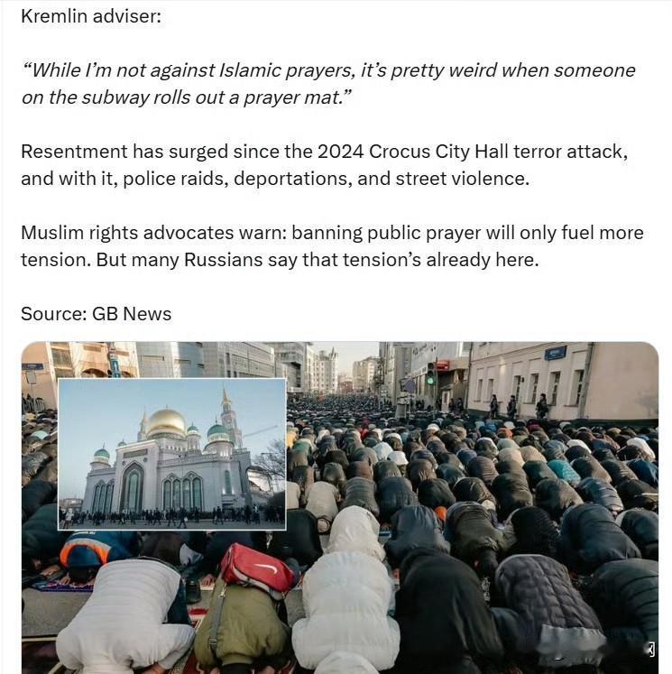 俄罗斯多座城市出现穆斯林移民在人行道、公交站、建筑旁甚至垃圾桶边公开祈祷的视频,引发当地居民强烈不满。 俄罗斯有数百万来自中亚的移民,却只有约七八千座清真寺,许多人说他们只能在户外祈祷,但当地民众认为这种行为“扰民”“挑衅”。