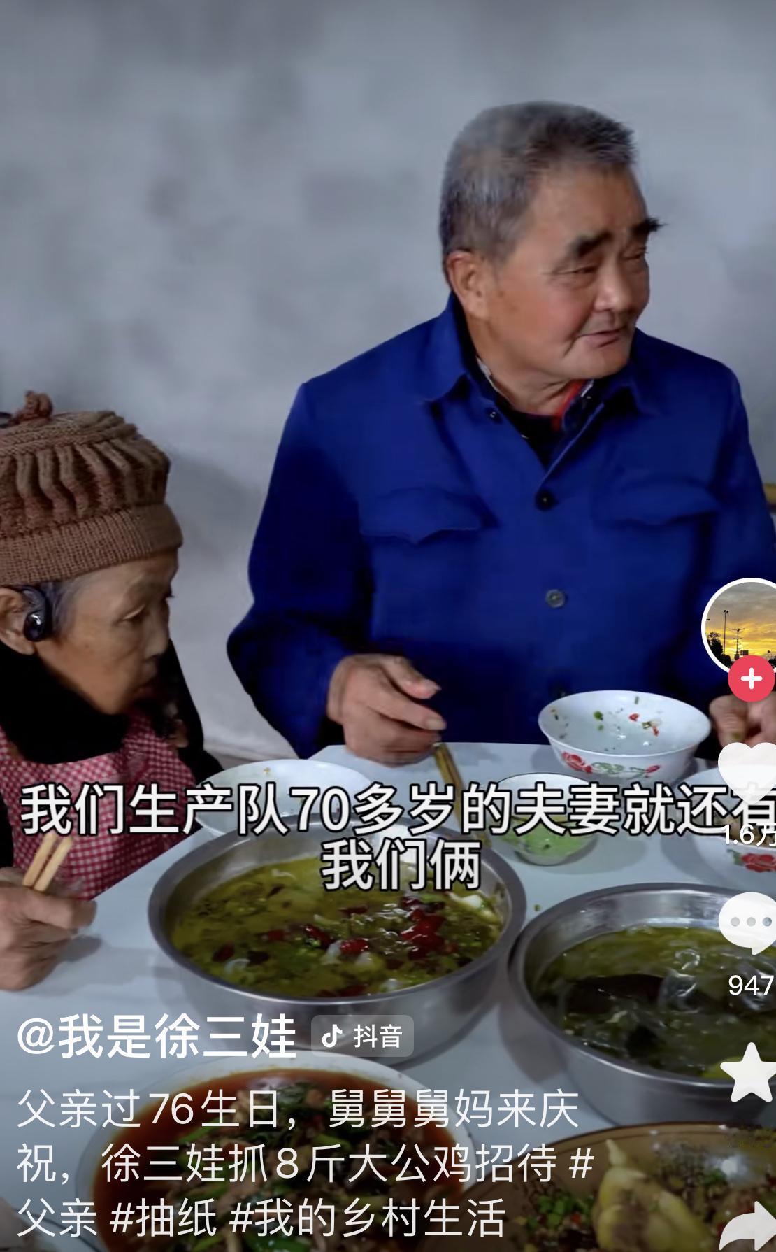 徐三娃的爸妈还是享福哦! 徐三娃的爸爸(五叔)过生,他三舅三舅妈来祝寿,杀了8斤的鸡,煮了美味的鱼,大家围坐在一起。 徐三娃的爸爸很开心,说,他们生产队70多岁的夫妻就他们老两口,他自己还是村里最大的老人,喜悦之情油然而生! 确实,以前徐三娃和他哥,每人给老人300元/月,后来三娃子媳妇主动给1千元/月,家里破破烂烂的房子也修得漂亮的小平房,日子越过越好! 三娃子的妈妈听力不好,也安了助听器。 老两口算是很有福气的了!