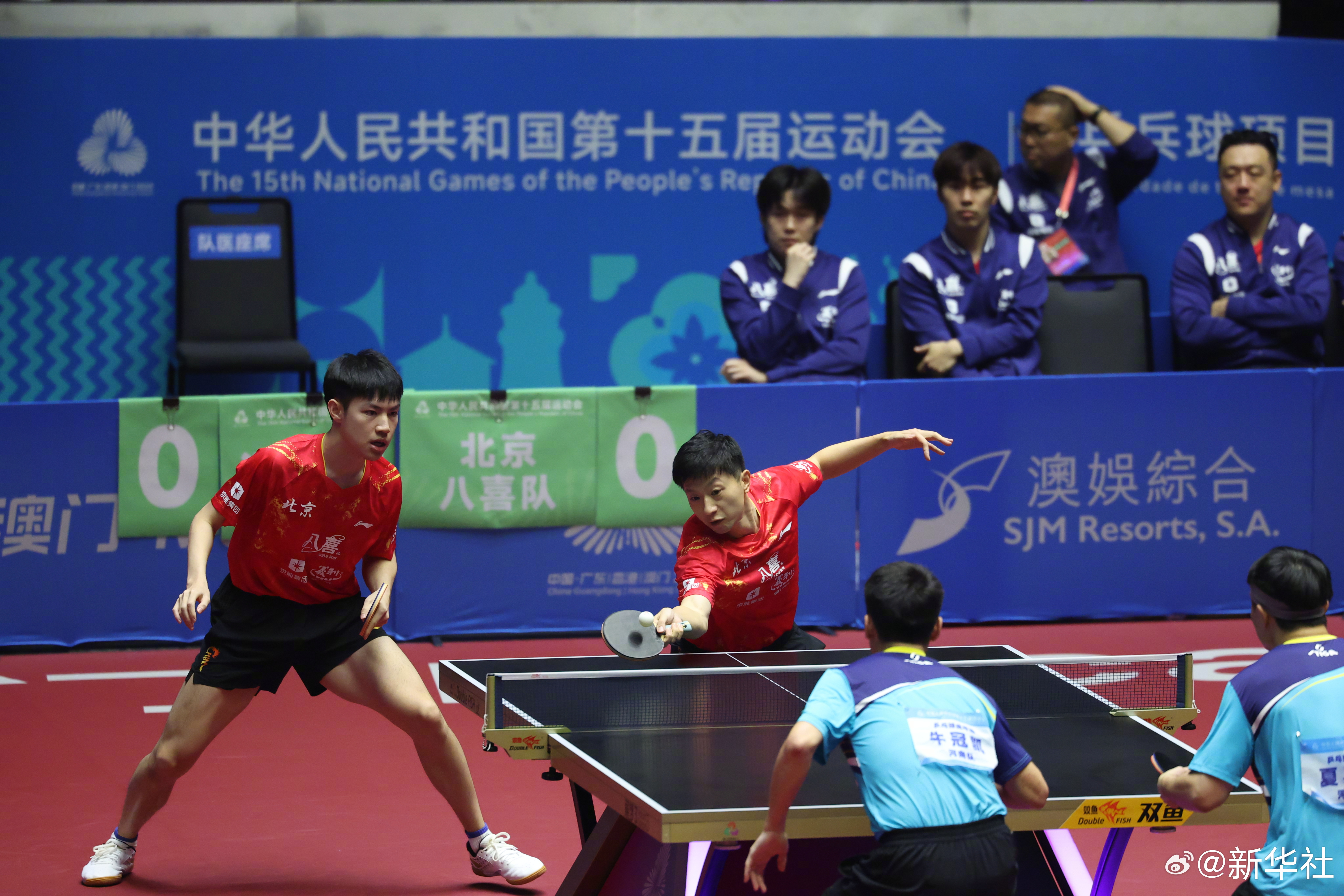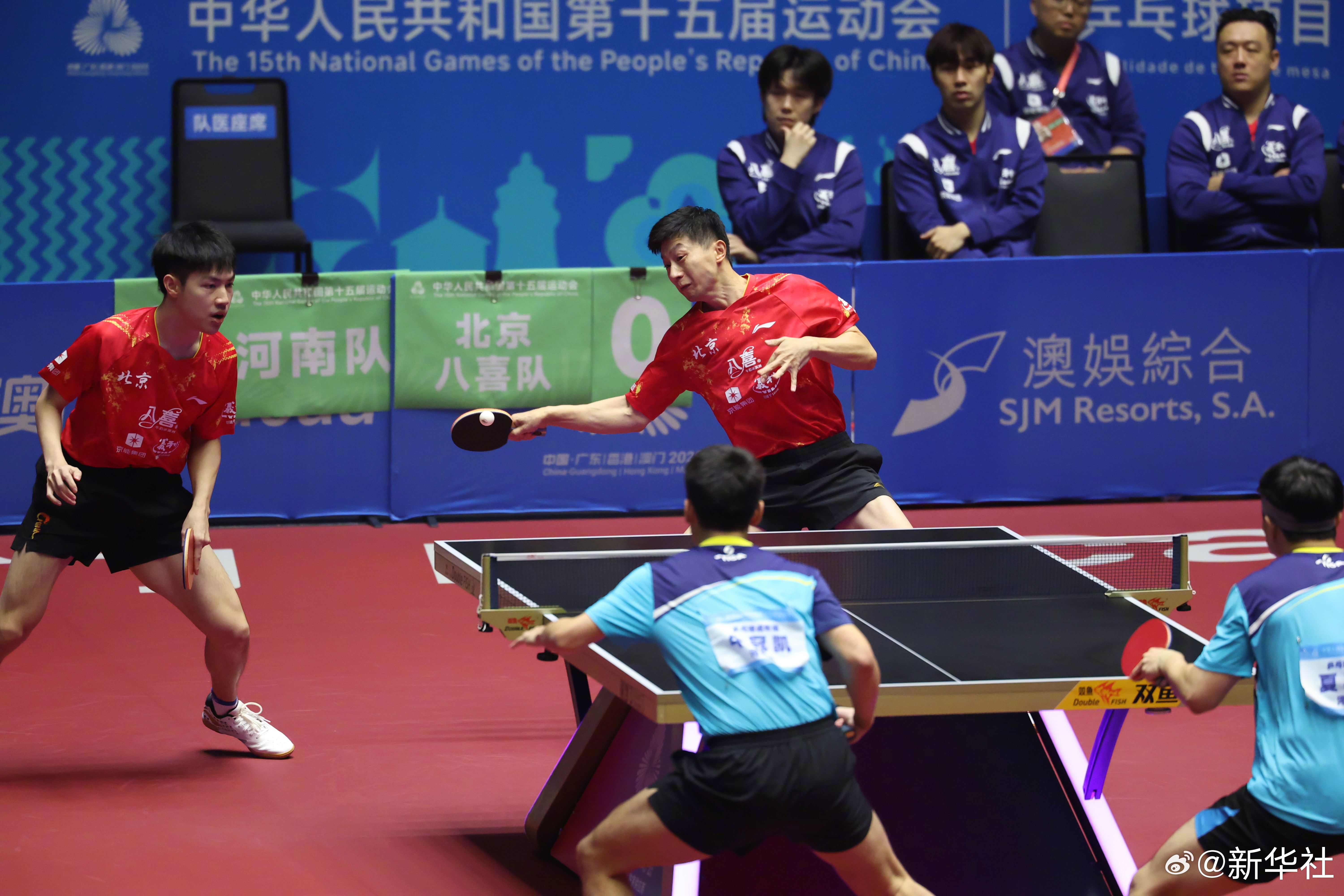 【全运会乒乓球团体小组赛:北京队胜河南队】11月14日,第十五届全国运动会乒乓球项目在澳门展开团体小组赛,马龙 等所在的北京队战胜河南队。