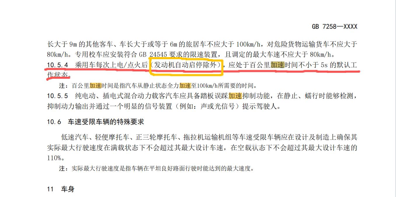 最新的《机动车运行安全技术条件》(征求意见稿)关于百公里加速时间的要求,其实就只有一句话,要求“每次上电或点火后”的默认工作状态是百公里加速时间不低于5秒,但是也说明了“发动机自动启停除外”,也就是说上电或点火后,车主是可以手动切换工作模式的。当然,这是车主主动的行为了,责任在车主,出了事就不要再怪车企了。
