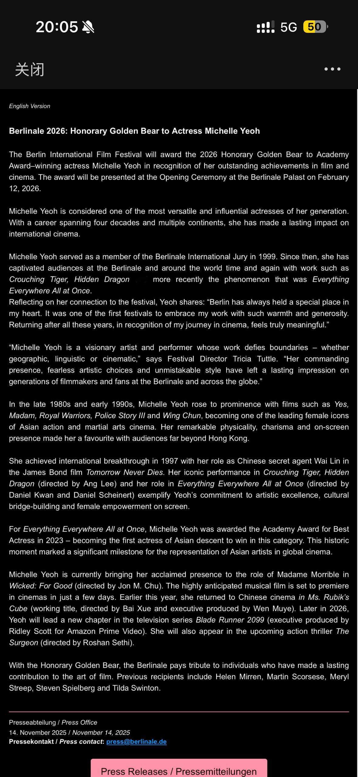 2026年柏林电影节荣誉金熊奖授予华人女星杨紫琼。