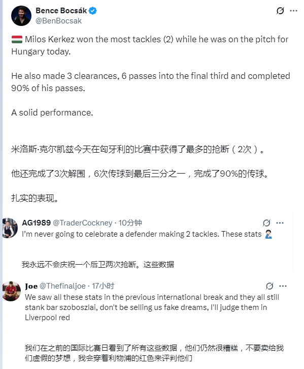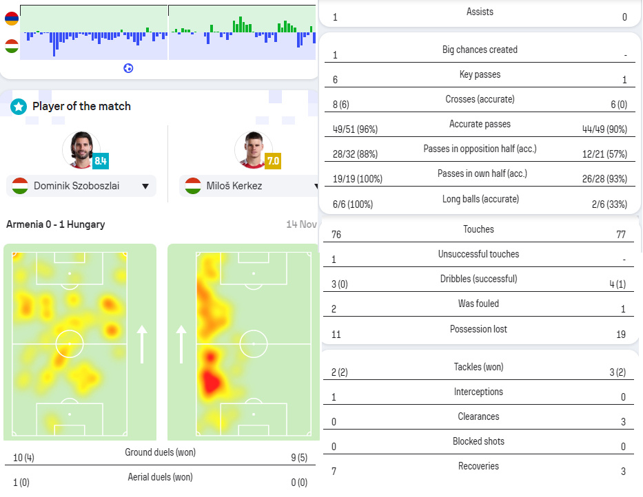 两匈弟均在对阵亚美尼亚的比赛中首发,重新搭档左路。尽管索博在上半场交出了期待的表现,但凯尔凯兹的发挥却引发本国媒体更多担忧。尽管49 次传球尝试完成 44 次(成功率 90%),但6 次传中均未找到队友,即便全队仅有索博的传中次数(8 次)比他更多(成功率 63%,8 中 5);而他的6次长传也仅有2次精准到位。 4 次带球突破仅成功 1 次(成功率 25%)。《民族体育报》的球迷评分属于中规中矩,但记者评价他,仿佛俱乐部的表现影响到了他的自信心他开场表现积极,第 18 分钟球落到他脚下时,他显得有些犹豫。第 32 分钟,他的启动相当出色,传球却出现失误,但与此同时,他踢得依旧果断。下半场过后,他有过几次精彩的处理,球也能稳稳停在脚下,只是仿佛在利物浦效力期间,他的自信心稍稍有所减退。