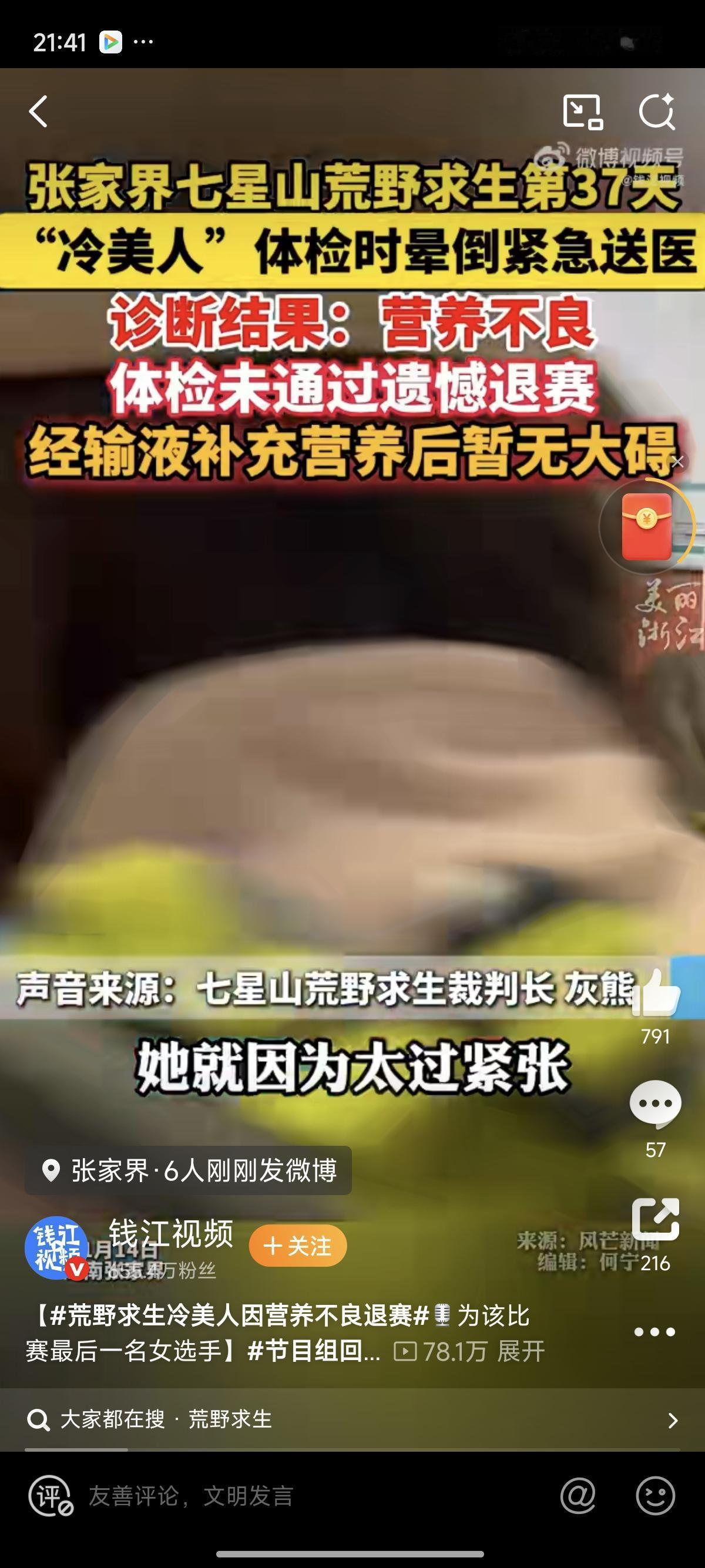 意难平!荒野求生冷美人37天极限坚守后退赛,网友:她早赢了 张家界七星山荒野求生赛场传来遗憾消息!人气选手“冷美人”杨朝芹,在坚持37天后因严重营养不良晕倒送医,最终体检未通过遗憾退赛,距离决赛仅差3天。 作为场上唯一的女选手,她的求生之路满是硬核坚持:开赛第二天就成功钻木取火,生理期第二天参赛却因劳累经期延长8天,疼到打滚误以为是肠梗阻,仍咬着牙不放弃。37天里,她采野果、烤蚂蚱、喝浑水充饥,手指嘴唇干裂,体重从105斤大幅下降,赛前的美甲假睫毛早已不见踪影,只剩满脸风霜和骨子里的韧劲。 期间她还遭遇过作弊质疑,好在赛事方核查后证实,她用6张赛事提供的锡箔救生毯拼接保温帐篷,完全符合规则。从最初的不被看好,到圈粉20多万,她那句“越是绝境,姐越冷静”的宣言,戳中了无数人。 醒来后她没抱怨退赛,反而反复念叨“给救援队添麻烦了”,让网友心疼不已。虽无缘20万冠军奖金,但她靠坚持赢得了特殊鼓励,更打破了“女性脆弱”的刻板印象。你被冷美人的坚韧打动了吗?欢迎在评论区为她留言加油~ 荒野求生女选手 荒野求生女战神 求生姑娘