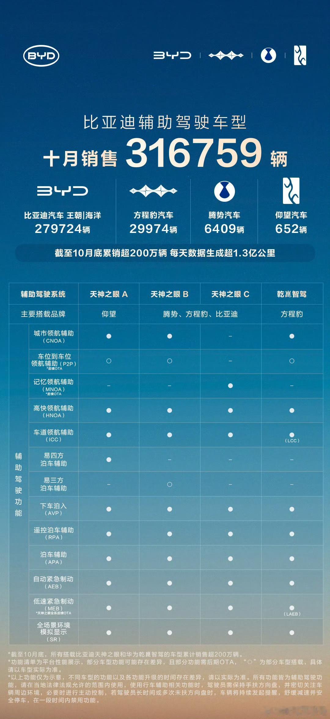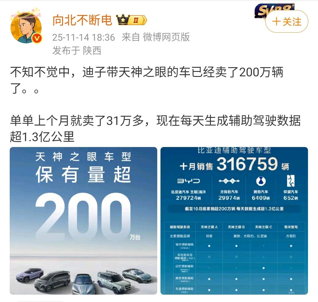 向北不断电:不知不觉中,迪子带天神之眼的车已经卖了200万辆了! 单单上个月就卖了31万多,现在每天生成辅助驾驶数据超1.3亿公里! 迪子的销售基础是十分庞大的呀,这样等于说这么多车辆都是带辅助软件的,这样等于对其他交通参与者有好处,因为安全性会大幅度的增加。 各位是怎么看的?欢迎评论区留言。