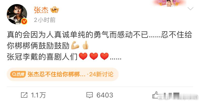 原来张杰也是《喜人奇妙夜》观众!被节目里的纯粹与勇气打动,方言化拟声“梆梆俩鼓励鼓励”既俏皮又暖心,把对真诚的认可藏在可爱表达里,这波鼓励谁不爱~