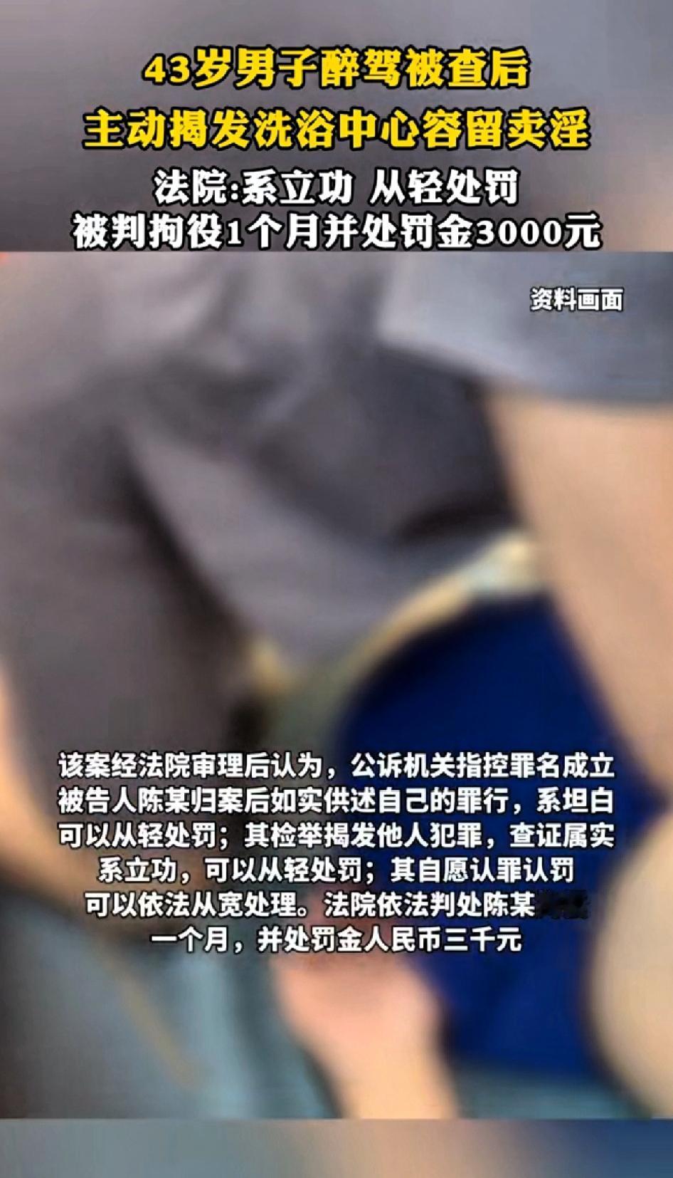 43岁男子醉酒驾车被查后,主动揭发洗浴中心容留卖淫! 法院:系立功表现, 可以从轻处罚,其自愿认罪认罚,可依法从宽处理。 法院依法判处陈某拘役1个月并处罚金3000元。[笑哭][笑哭] 不得不说这男子的行事作风真是让人大开眼界,首先去洗浴中心嫖娼再先,后又醉酒驾车。 本想主动检举揭发洗浴中心的违法行为,打算以功抵过,最终法院念其主动认罪认罚且态度良好!最终依法从宽处理[笑哭][笑哭] 嫖娼的哪有什么诚信可言! 洗浴中心老板百密一疏各种防范,想破头也不会想到会以这种方式伏法。[笑哭][笑哭][笑哭]