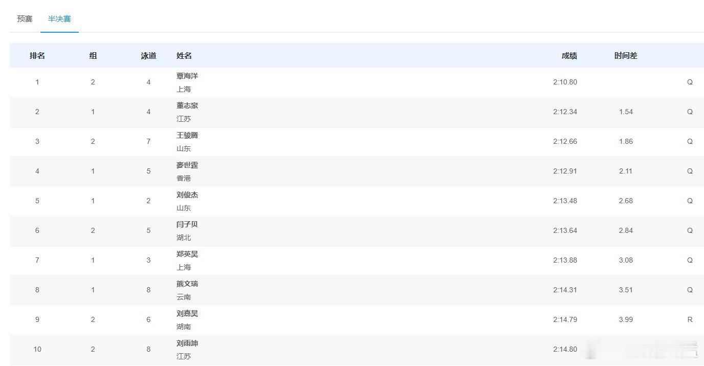 全运男200蛙半决赛覃海洋压倒性成绩排第一 信心满满冲击他首个全运三连冠11月14日晚,全运会游泳大项结束了男子200米蛙泳半决赛,该项目世界纪录保持者、上海队选手覃海洋以2分10秒80的成绩排名第一。和预赛一样,半决赛覃海洋再次对上国家队老战友、湖北队的闫子贝。前半程,还是一贯出发凶猛的闫子贝领先,成绩是1分02秒64,闫子贝1分02秒88排名第二。后半程转入覃海洋控盘阶段,超强的耐速结合能力,得到充分体现,最终覃海洋以2分10秒80排名小组第一。第一组的江苏选手董志豪,再次祭出最后50米狂撵的战术,150米第三位的他,加速猛冲,最终以2分12秒34拿到小组第一。总排名覃海洋第一,董志豪第二,两位世锦赛该项目冠军,将第二次在全运会决赛对决。上届全运会覃海洋战胜闫子贝夺冠,当时董志豪获得第四名。覃海洋虽然是第三次参加全运会,但只有200蛙实现连冠,这次他将冲击200蛙全运三连冠。