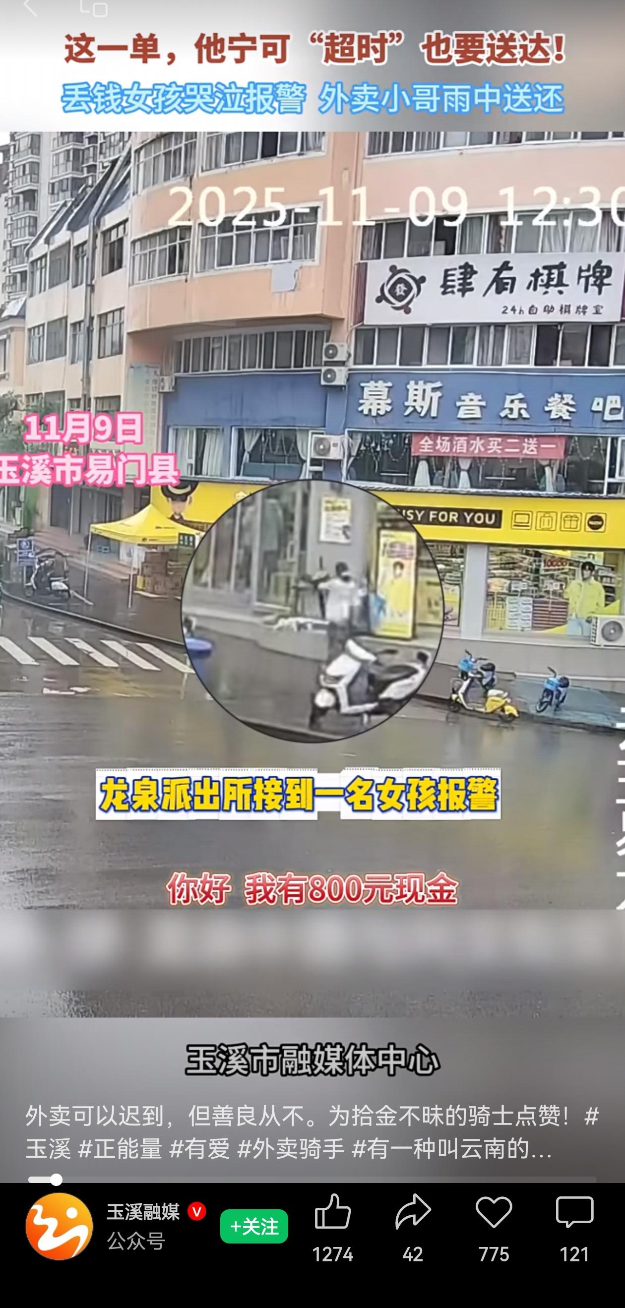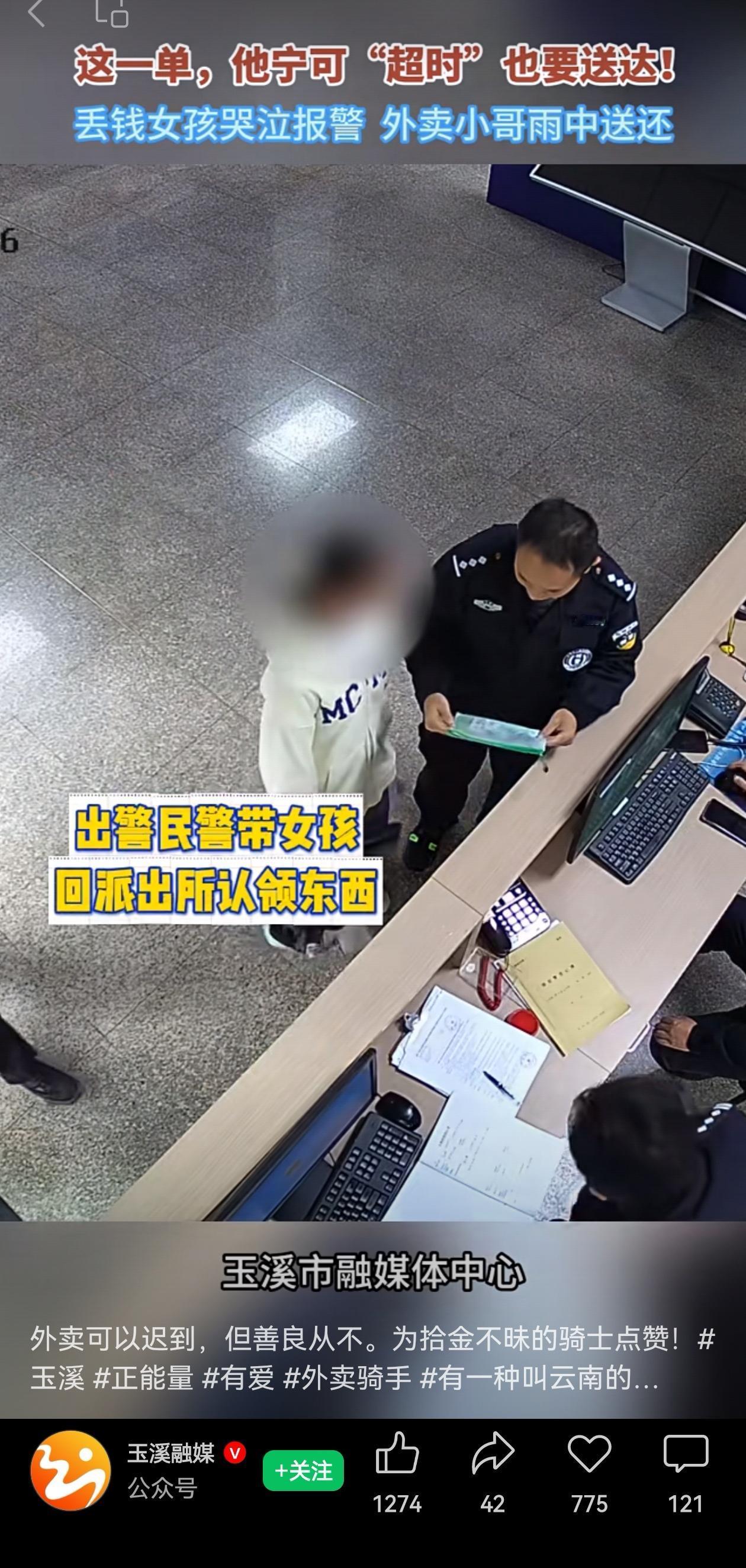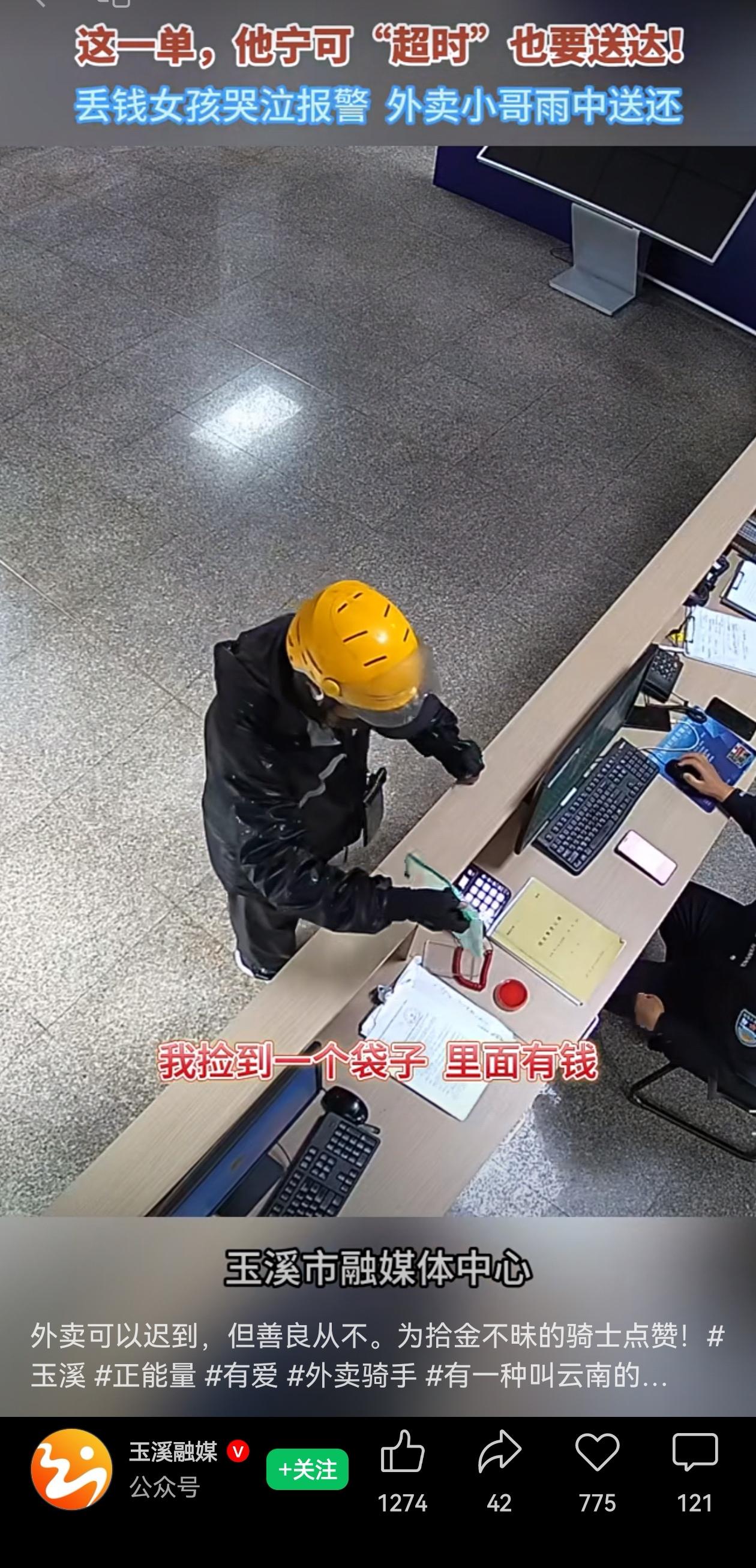 云南玉溪易门县,天正下着雨,110接到一个女孩的报警电话,边哭边说:“你好!我有800元的现金,放在一个绿色的袋袋里面,丢失了”! 于此同时,龙泉派出所接待了一位快递员:“我捡到一个袋子,里面有钱,里面有多少钱我也不知道。”说完,扭头就要往外走。 “要走了吗”?警察问。 “是的,我外面还有两个外卖单子要送”,说完这位快递员转身又冲进了雨里…… 这位外卖大哥捡到了钱,800多块,钱不多,但是跑快递要跑多少单啊?而且明明还有单子要赶,但是他却想都没想就冒着雨往派出所跑。 超时要被扣钱?在派出所一句没提,但是匆匆的脚步可真的一刻没敢多留啊! 外卖大哥的纯粹朴实,在这个精打细算的世界里,显得格外珍贵。不善言辞,却用行动诠释了什么是善良的本能。 为这位外卖大哥点赞!小小善举不张扬让,却让因为丢钱而哭泣的女孩,能够失而复得,最后让这个雨天格外温暖…… 为这样的普通人点赞! 信息来源:玉溪融媒