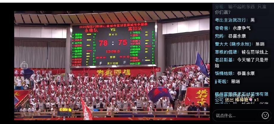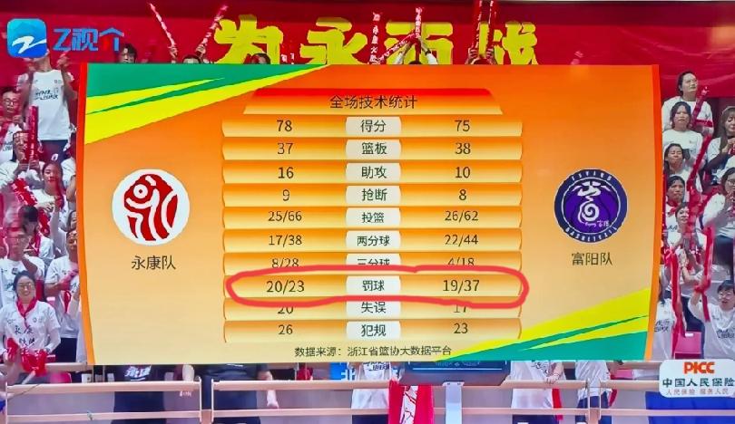 永康主场78:75击败富阳,终结了对手的11连胜。 赛后统计显示:富阳队今晚输就输在罚球命中率太低,37罚19中,50多一点的命中率,委实有点太拉胯了。而反观永康队,罚球命中率高的吓人,23罚20中,几近90%的命中率,比职业赛场的命中率都要高了。 有可能是今晚永康主场的氛围给了富阳队球员足够的压力吧?如此看的话,今晚在现场的永康球迷功不可没!