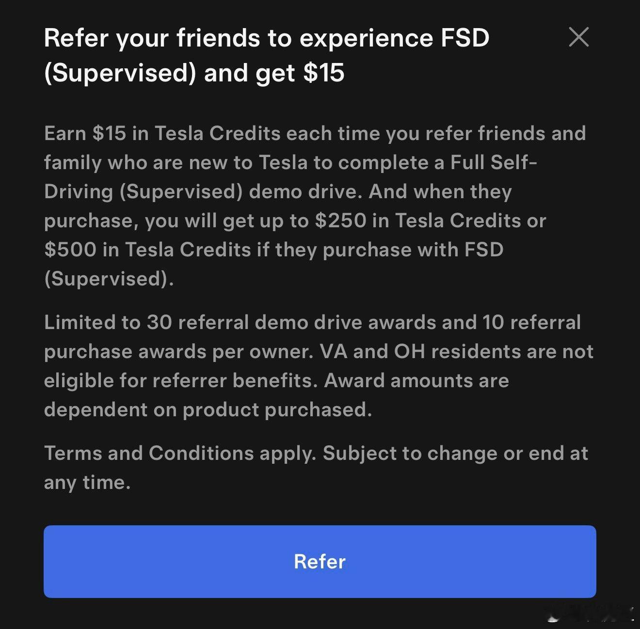 特斯拉正在加大力度推广FSD(北美)特斯拉现在将奖励15 美元的特斯拉积分,只要推荐一位特斯拉新用户并完成 FSD 演示驾驶。仅限 30 个推荐演示奖励名额(总计 450 美元)。当他们购买车辆时,将获得最高 250 美元的特斯拉购车抵用金;如果他们购买的是 FSD(监督驾驶)版本,推荐人将获得最高 500 美元的特斯拉购车抵用金。