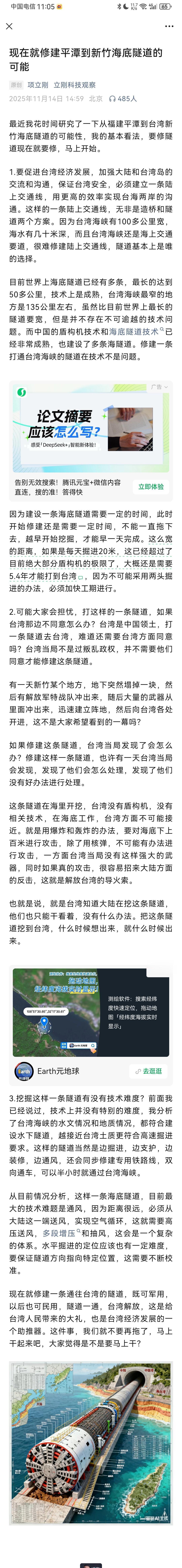 项立刚提出建议,现在就可以开始修建从福建平潭到台湾新竹的海底隧道! 项立刚说,他最近研究了一下修建从福建平潭到台湾新竹的海底隧道的可能性,发现修建这个隧道,首先在技术上就没有什么难度,因为现在修建海底隧道的技术已经很成熟了,更加重要的是台湾海峡的水文情况、地质情况,也非常稳定,适合修建海底隧道;其次是想要连通大陆与台湾岛,修建海底隧道是更加合适的选择,台湾海峡水深50多米,宽度达到100多公里,不太适合建桥,但是海底隧道是非常合适的;最后则是,修海底隧道需要时间,既然需要时间,那么自然是越早越好。 至于台湾的反对,那更是无所谓,首先我们要修就修,不需要取得他们的同意,其次则是如果我们真的开始修建,台湾也没有任何能力干涉。 笔者认为,项立刚的这个建议还是挺不错的,台湾是我们的不可分割的一部分,早日修建海底隧道,早日将我们大陆与台湾连接在一起,是一个大好事!
