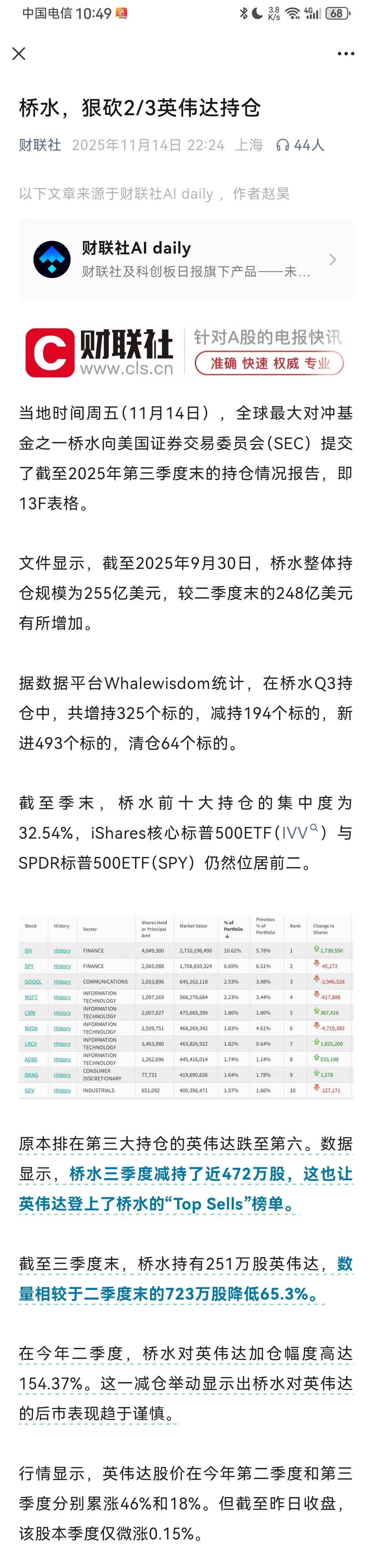 财联社11月14日报道说,全球最大对冲基金桥水基金,竟然也减持英伟达了,之前持有英伟达732万股,这次一口气就减持了472万股,狠砍对英伟达的2/3持仓! 在这段时间,首先是华尔街传奇大空头迈克尔·伯里强势做空英伟达,接着软银集团也紧随其后,直接清空了英伟达所有股份,套现58.3亿美金,现在又是桥水基金,也狠狠减持了一大把。这几个知名金融机构投资机构,集体性做空或者离开英伟达。 从这些金融机构的动作来看,他们应该是对英伟达失去了信心。英伟达的泡沫已经很明显了,膨胀到了一个超出众人想象的层次,谁都怕这个泡沫破裂,因此都抓紧时间开始离场。 从英伟达的这个遭遇来看,现在美国金融市场,对于人工智能产业的发展,应该是持有越来越来悲观的看法了。不是悲观于这个技术层面上的发展,而是悲观于美国股市吹起的这个人工智能产业的巨大泡沫! 人工智能产业的确是表现出了巨大的潜力,但是其现在的成就以及未来的潜力,是否匹配得上现在这个人工智能产业的市值?这是一个大问号。 毕竟,相比于对人工智能产业的投资金额,现在诸多人工智能应用,都并没有表现出匹配这个投资金额的回报率,更像是一场基于人工智能产业发展出来的金融泡沫! 、 所以,市场开始给这一场人工智能产业的金融泡沫降温了!