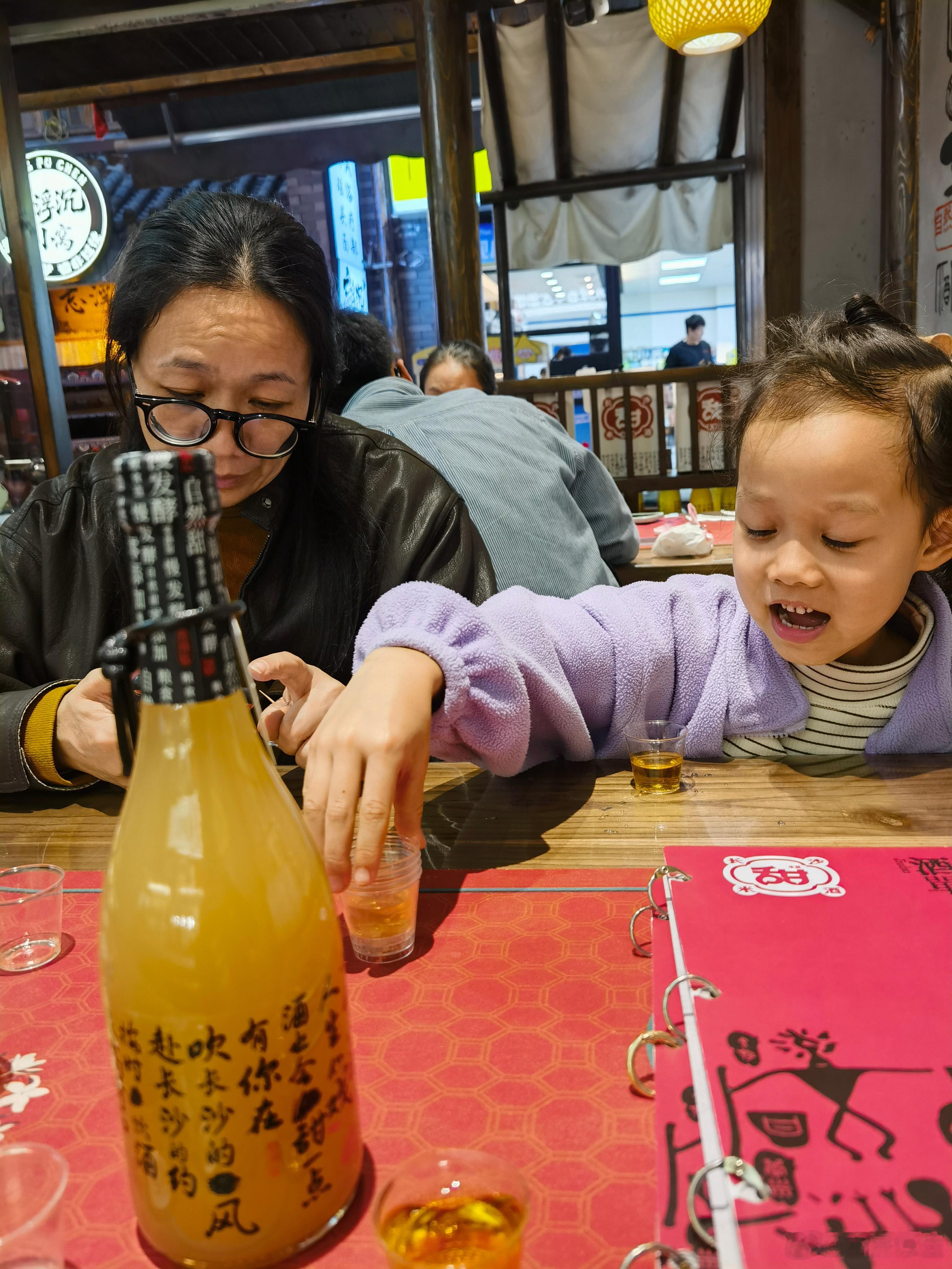 夜逛都正街青灰的暮色是从天心阁的飞檐上开始滴落的,一点点晕染开,渗进广场的石缝里,又被我们杂沓的脚步声惊起。月月的小手汗涔涔地攥在我掌中,像一尾不安分的、温热的小鱼。妻走在前头,白色的运动服在将夜未夜的空气里,成了一盏朦胧移动的灯。转进都正街,便像是猛地扎进了一个温暾的、喧嚷的旧梦。那喧嚣不是劈头盖脸的,是丝丝缕缕,从每一扇雕花的木窗,每一盏昏黄的灯笼,每一块磨得光润的青石板上蒸腾起来的。光影是流动的,人的笑语,食物的油气,店家招徕的软语,都搅在这光影里,成了稠嘟嘟的一片。月月的脚步,先是被一个吹糖人的老者钉住,随即又被空气里那股子甜丝丝的、带着些微酒糟气的味道勾了去。那是一个支在街角的小摊,一口锃亮的铜锅里,小钵子甜酒正咕嘟咕嘟地冒着暖人的气泡。抵不住的,何止是孩子。我们便挤在一条窄窄的长凳上,看那摊主用一只薄薄的铝勺,在钵子里轻巧地一旋,一提,一倾,半凝的、乳白的酒酿便滑入白瓷碗中,再兑上滚烫的糖水。月月吃得急了,鼻尖上沾了一点白,又被那一点恰到好处的酒意醺得眯起了眼,咧着嘴,露出新掉的牙豁,傻傻地笑。这甜,是纯粹的、孩童的甜,直愣愣地撞进来,没有一丝迂回。既是开了酒戒,索性便转进了那家“承源”。店里是另一种光景,暗沉沉的,空气里浮着的是陈年米酒更醇厚、更沉静的气息。黑褐色的酒坛子默然地立着,像一群守夜的老人。我们便要了新旧两样。新酒清冽,入口是鲜活的跳跃,带着糯米初绽的芬芳;老酒却稠黄如蜜,滑过喉间是温顺的,然而一股绵长的后劲,却悄悄地、固执地从丹田里暖上来。妻呷了一口老的,便不再饮,只微笑着看我们父女俩。月月是用舌尖尝的,立刻皱起了眉,把头摇得像拨浪鼓,她是不懂这时间酿造出的复杂的醺然的。肚子里的酒虫安稳了,食虫却又叫起来。妻在“扶记小吃货”点了一桌,碗盏叮当,是红尘里最动听的音乐。月月的注意力,却早已被隔壁小酒馆里飘出的歌声拴住了。那是一个沙哑的男声,抱着一把木吉他,悠悠地唱着些听不清词句的歌。她不认得那些旋律,却认得那份自由与怅惘。她扒在门框边,只探进半个身子,小小的背影被门里的光拉得老长,一动不动,像一尊被音乐灌醉了的小小雕像。我掏出手机,屏幕的冷光在这满街的暖色里,显得有些不合时宜。可我还是想记下这一刻。镜头里,妻的侧脸在灯笼的光里柔和得像一个梦,月月回头看我,眼里还漾着歌声的余波。我们一家人,便这样沉甸甸地、心满意足地沉入这市井的烟火里,像几粒被投入温水中的糖,慢慢地、身不由己地融化开来。只是,这融化里,总有一小块是硬硬的,硌着心。那该是留给芊芊的。若是她在,定会皱着眉,老气横秋地评点这甜酒太甜,那老酒太浊,然后一面说着,一面却又悄悄地把我们碗里的吃食都尝个遍吧。这满街的热闹,便因了这一个人的缺席,终究成了一幅未曾完全染色的画,热闹底下,透着一角洗不掉的、冷清的底子。