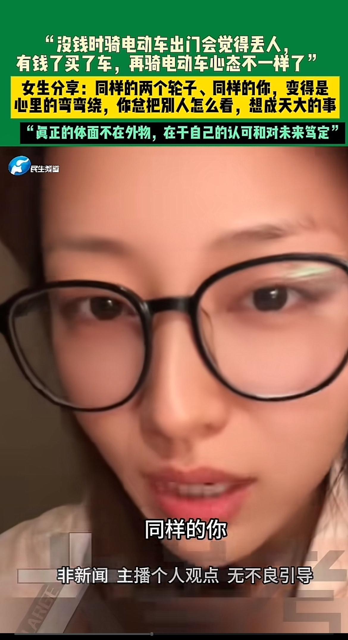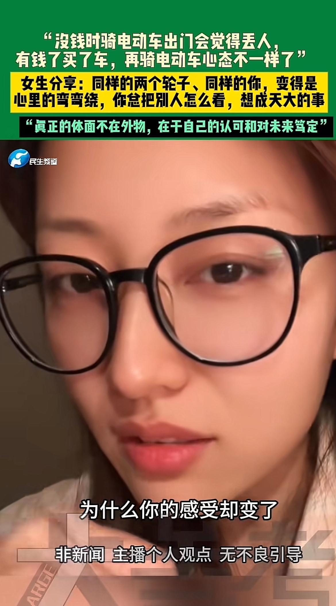从前没钱的时候,骑电动车出门就怕遇见熟人,总感觉特别丢脸。生怕别人在背后指指点点,仿佛骑电动车就矮人一头似的。 后来有钱买了车,再骑电动车时,心态全然不同了。想想看,同样的电动车,同样的自己,风还是那股风,感受怎么就变了呢? 其实,是我们太把别人的看法当回事,还给各种事物都贴上了标签。但实际上,那些所谓的“观众”根本没留意你。真正自信的人,不会被外在事物左右。真正的体面,不在于开什么车、穿什么衣服,而在于内心对生活的热爱。