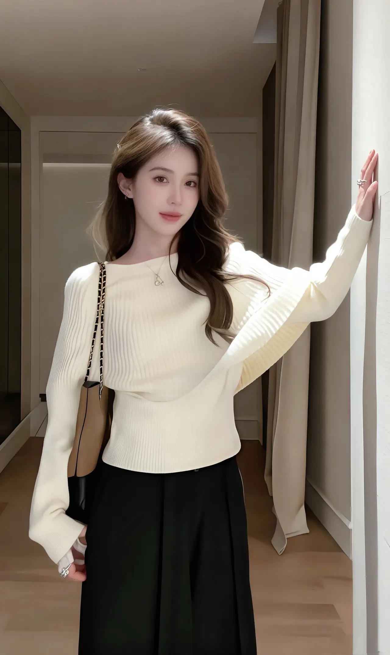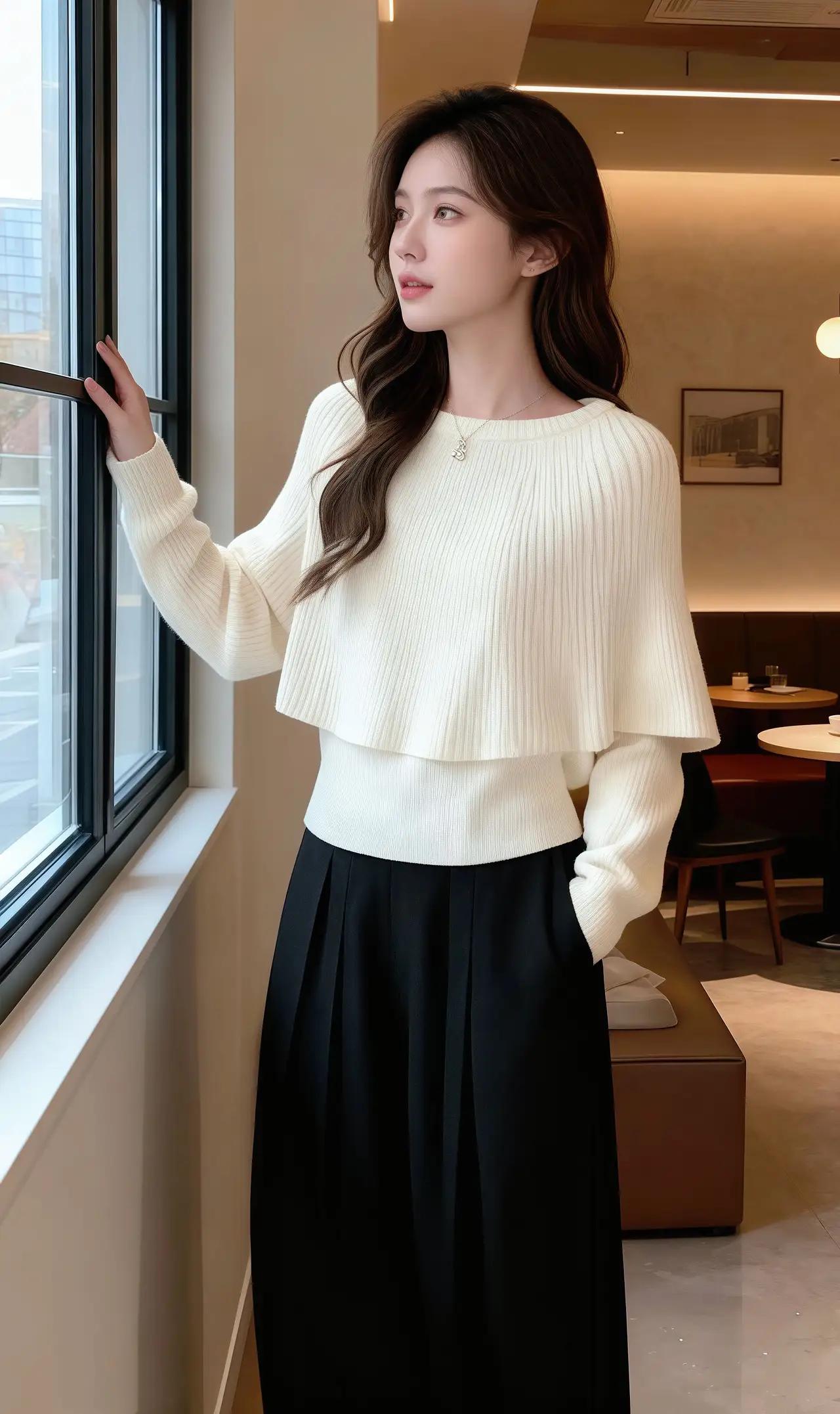 《窗边的定格》 玻璃窗上凝结的水雾模糊了外面的建筑轮廓,却让室内的光线更显柔和。她站在窗边,白色针织毛衣的袖口随着抬手的动作轻轻滑落,露出纤细的手腕。那件毛衣的纹理像初春解冻的溪流,在腰间自然收束后又散开成涟漪般的下摆,每次呼吸都会带起衣料的细微起伏。 黑色长裙垂坠如墨,在脚踝处堆叠出优雅的褶皱。她插在口袋里的手指无意识摩挲着裙料,指甲盖泛着珍珠般的光泽。窗框的木质纹理透过薄毛衣渗进掌心,凉意顺着血管蔓延,却意外地让人心安。项链的月牙吊坠在锁骨间轻轻晃动,每当她转头时,银光就会在颈窝投下一小片流动的阴影。 墙上的装饰画框住了一角天空,画布上的蓝色比窗外真实的天空更浓郁些。桌椅的倒影在地板上拉得很长,仿佛时光在这里被刻意放慢了流速。她的卷发有几缕散落在肩头,发梢还带着洗发水的淡淡花香,混着从窗缝渗进来的、带着凉意的空气,在鼻尖交织成特别的味道。 这个瞬间像被琥珀凝固的松脂,所有的细节都在柔光里纤毫毕现。毛衣的每一针脚都在讲述手作的温度,裙摆的每道褶皱都藏着风的形状,就连窗外建筑模糊的轮廓,都成了恰到好处的留白。她忽然觉得,或许最美的风景不在窗外,而是此刻这个被光影温柔包裹的自己。