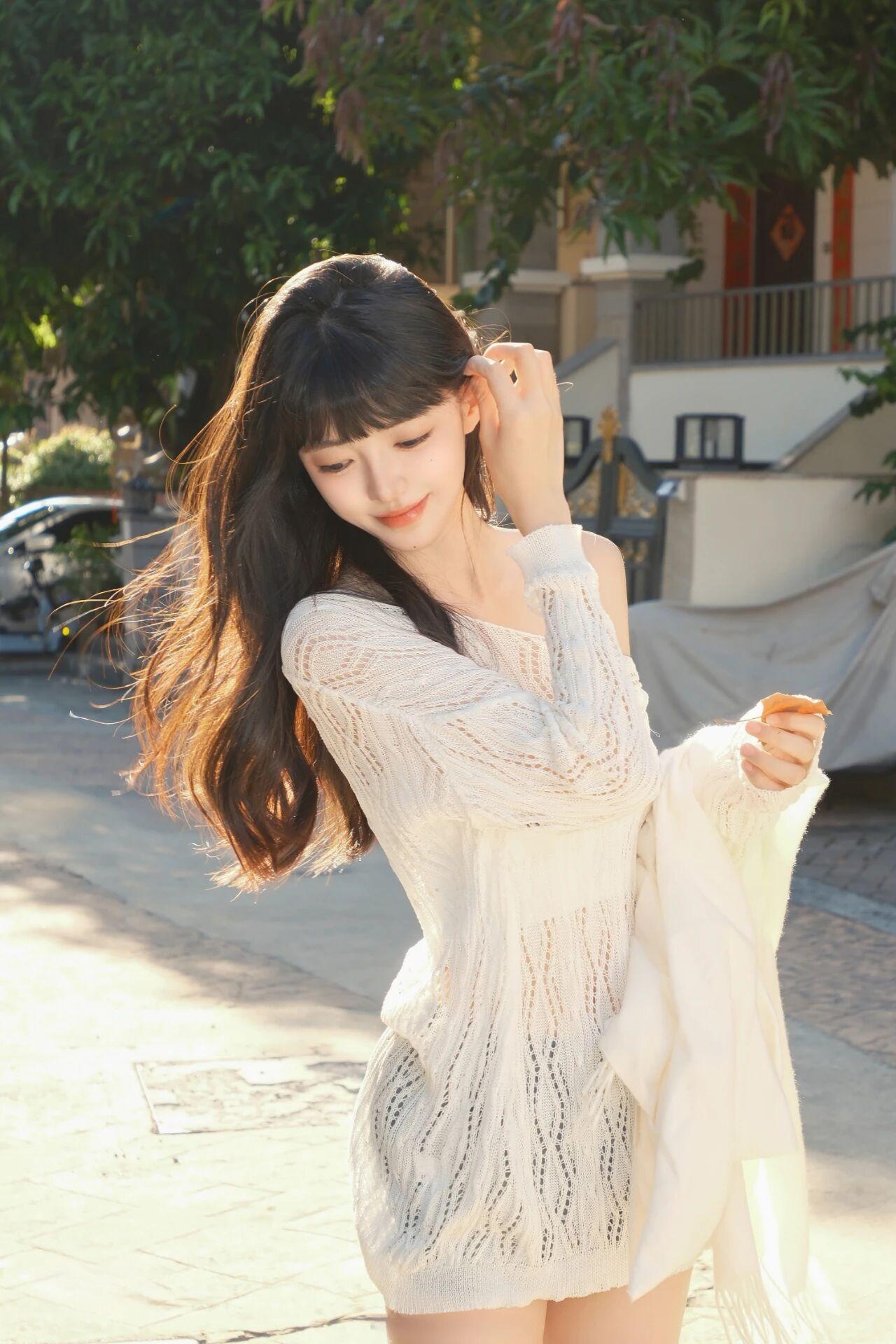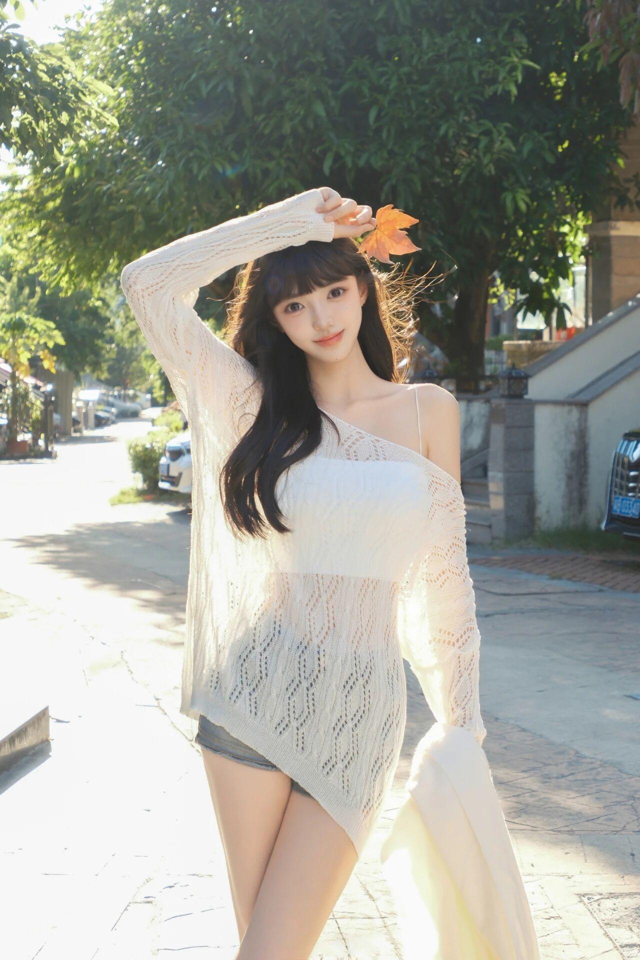 《秋日的私语》 阳光像被筛子滤过,在白色蕾丝裙上织出细碎的金斑。她站在落叶纷飞的林间,指尖悬停着一枚将落未落的银杏叶,叶片边缘的锯齿在逆光里清晰得像工笔画。长裙的蕾丝花边随着山风轻轻颤动,像无数只透明的蝴蝶停在裙裾,镂空针织开衫的网眼漏下光点,在她锁骨处投下细密的阴影。 长发被风掀起时,发梢染上了蜂蜜色的光晕。她微微仰头,颈项弯成天鹅的弧度,阳光顺着这个弧度流淌,在蕾丝吊带与肌肤相接处凝成珍珠似的光点。悬空的银杏叶突然打了个旋,叶柄擦过她无名指的婚戒,金属的凉意与叶片的温热在皮肤上交叠。远处传来山雀的啁啾,声音撞在树干上,碎成细小的音符落进她发间。 针织开衫的流苏穗子扫过手背,痒得像春蚕啃食桑叶。她忽然想起去年此时,也是在这片银杏林,他藏在落叶堆里突然起身,惊飞的黄叶落了她满肩。此刻阳光把记忆晒得暖烘烘的,连风里都带着那时的笑声。裙摆扫过满地落叶,发出窸窣的轻响,像无数个秋日在窃窃私语。