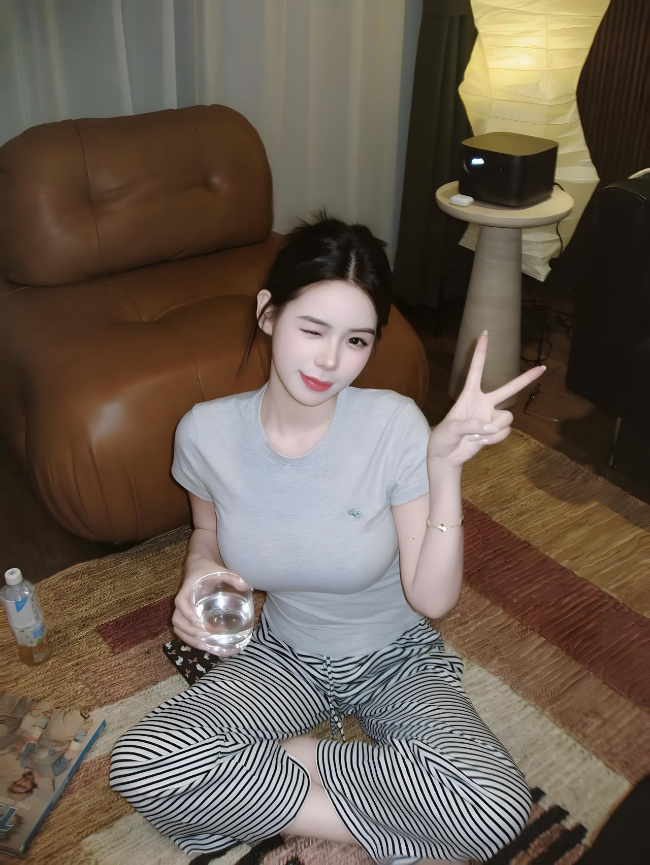 《温馨午后》 午后的阳光透过窗帘洒进房间,给一切都镀上了一层温暖的金色。她坐在那张棕色的沙发上,整个人都陷进了柔软的靠垫里。浅灰色的短袖T恤在光线下泛着柔和的光泽,胸口那个绿色的小图案像一片落在衣襟上的薄荷叶,清新得让人忍不住多看两眼。 黑白条纹的宽松裤子随意地垂在沙发边缘,像钢琴键般错落有致。她蜷起双腿,露出脚上那双印着卡通图案的袜子——一只黄色的小鸭子正歪着脑袋,仿佛在好奇地打量这个安静的世界。透明的水杯在她手中轻轻摇晃,杯壁上凝结的水珠折射出细碎的光,像撒了一把星星在杯子里。 手腕上的细手链随着她的动作轻轻晃动,链坠是个小巧的月亮形状,在阳光下闪着银光。她的目光落在旁边的白色小圆桌上,黑色的投影仪安静地立在那里,像一只等待起飞的甲壳虫。她想象着夜晚降临后,这个小小的机器会把整个房间变成星空,那些闪烁的光点会落在她的条纹裤子上,落在水杯里,落在她弯起的嘴角上。 这个午后的时光,就像她手中那杯清水一样清澈透明,又像背景里棕色的沙发一样温暖踏实。所有的细节都在诉说着生活的美好,那些看似平常的物件,在这个特定的时刻里,都成了温柔的注脚。