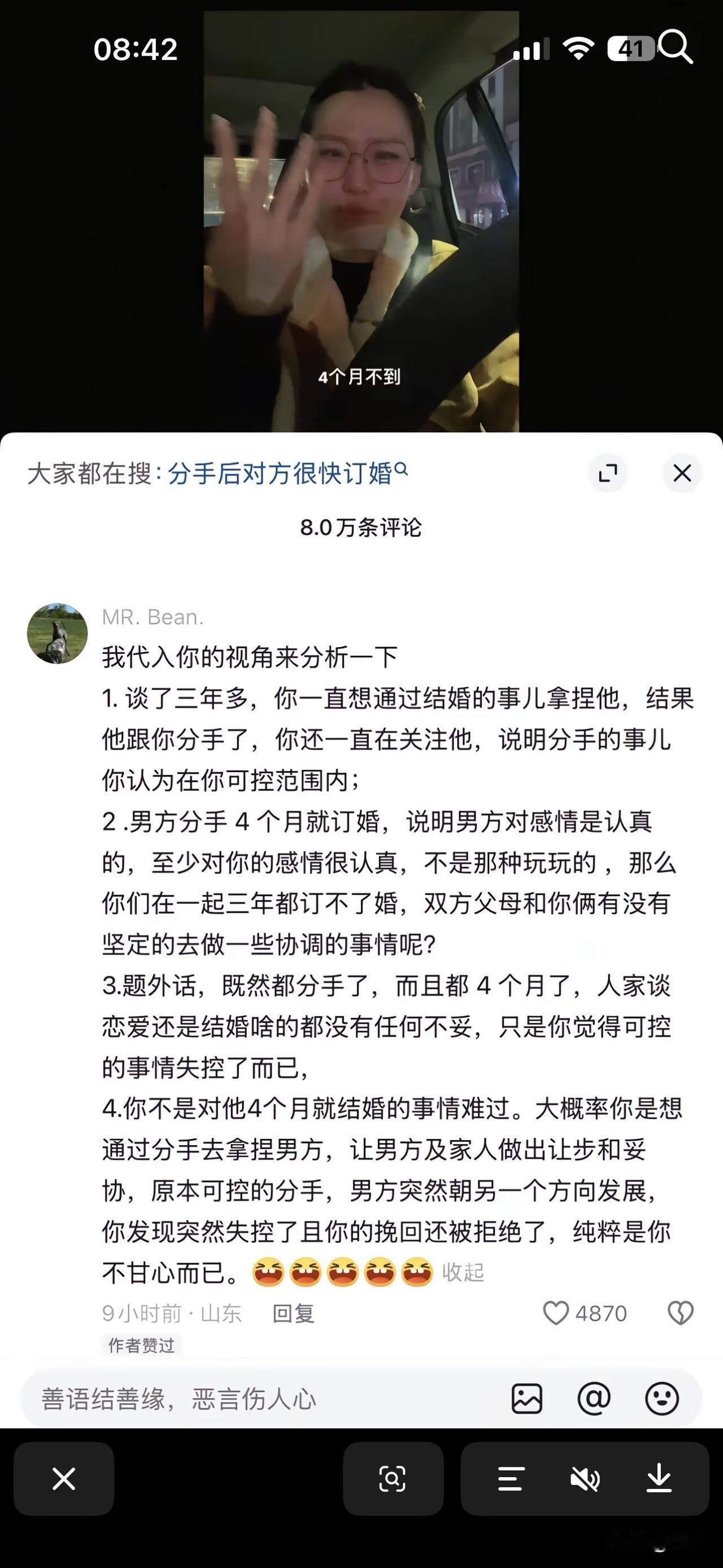又是一个女权分子的极端思维 近期网上出现一女子因和男友分手后,因男友在4个月后结婚💒而网暴对方。没想到翻车,全部网友骂他没良心,针对此事,大家怎么看?
