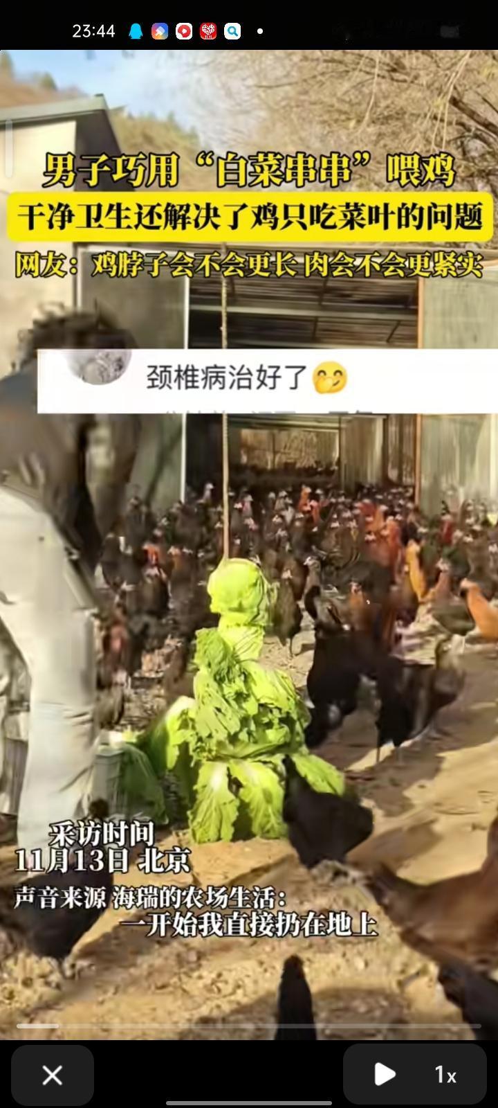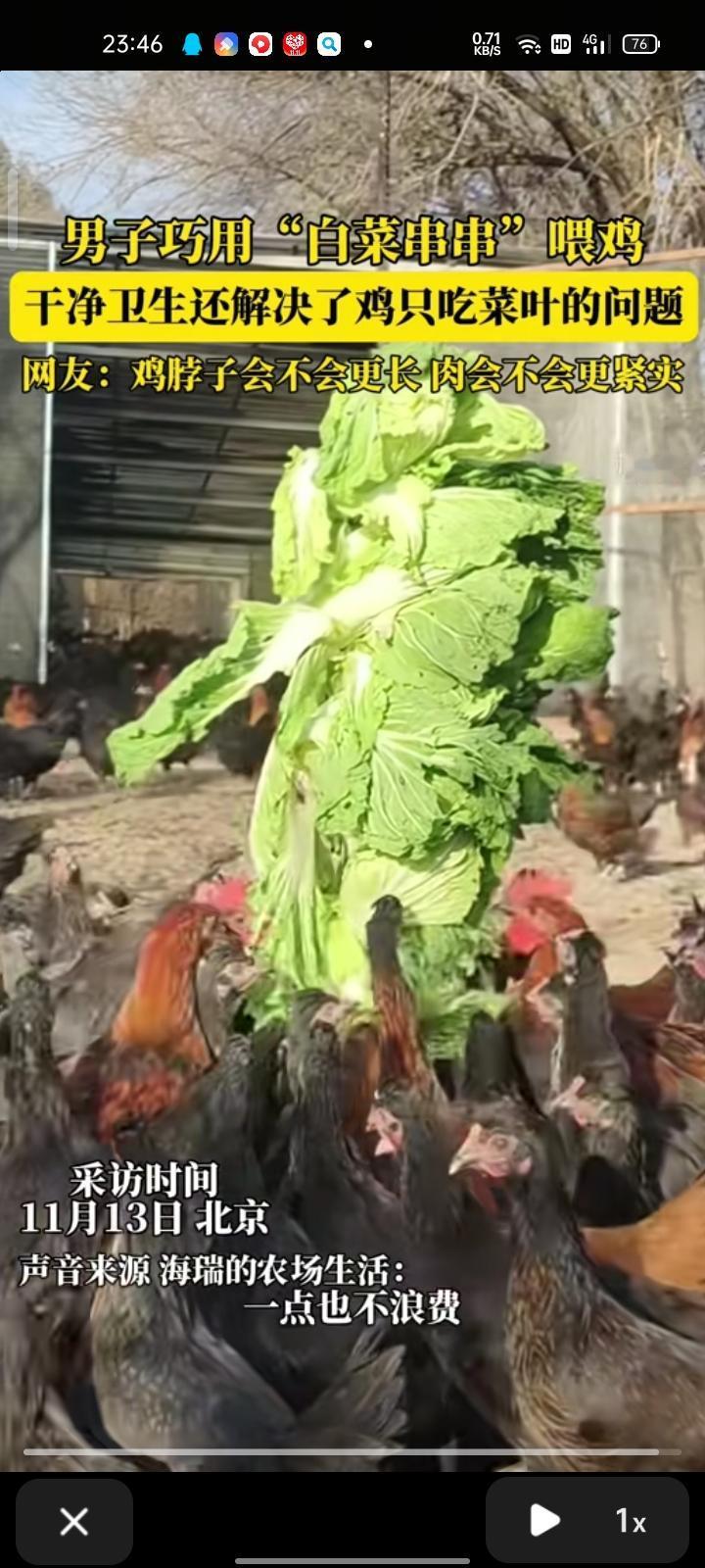 11月12日,北京。男子巧用“白菜串串”,不仅干净卫生,解决了鸡只吃菜叶的问题。当事人表示,一开始直接把菜扔地上,鸡一踩就把菜踩脏了,不仅不卫生,还怕它们闹病,这些鸡还特别挑嘴,光挑菜叶子吃,白菜梆子全剩在那,才想出这个办法。