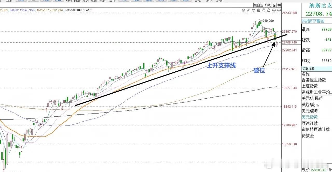 晚上11点过10分,美股三大指数集体低开,目前纳指低开走高有所反弹,但纳指已经形成关键技术破位。现在是晚上的11点过10分,截至目前为止,纳斯达克指数的跌幅由先前的跌超1.8%,缩窄至跌0.39%。人工智能的总龙头英伟达,开盘跌幅一度超过3.%。就在刚才也有瞬间翻红的动作。不过从美股纳斯达克指数的技术面来看,目前纳斯达克指数已经形成了光线的技术破位。最近的一条原始上升支撑线目前已经被跌破。大家请看下图——纳斯达克指数日线图。破位之后意味着接下来反弹难度加大,并且中长期的的上升趋势可能从今天开始,已经转为短线调整性质了。美股今天晚上的交易才刚刚开始,今天先和大家说到这里,明天早上我再做一个视频的分析。大家点赞,评论➕关注就是对莎莎这个纯技术派的最大支持,大家晚安