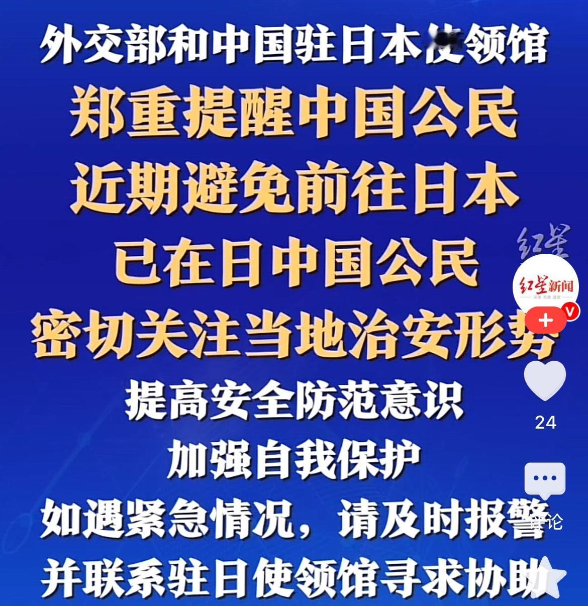 外交部和中国驻日使馆郑重提醒中国公民,近期避免前往日本。已在日中国公民,密切关注当地治安形势! 高市,全世界都在看你还能犟多久!天堂有路你不走,地狱无门你偏要闯!