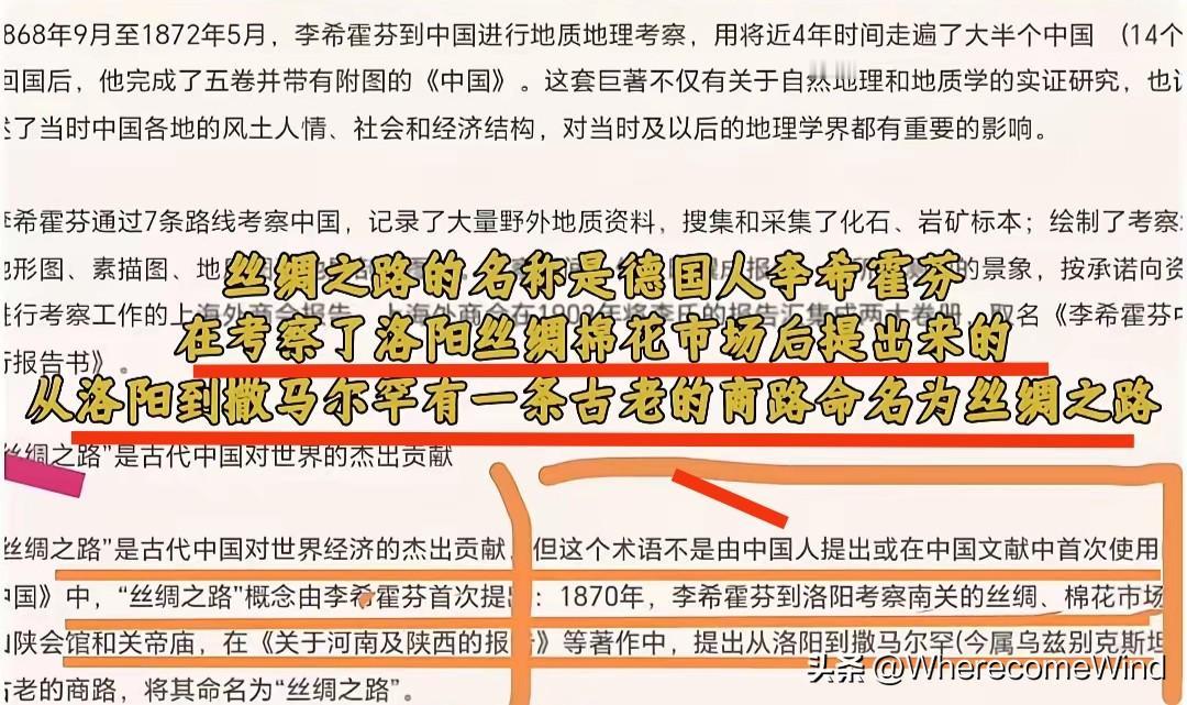 丝绸之路是李希霍芬在洛阳提出的吗? 不是,是谎言! 丝绸之路是李希霍芬1877年提出的,并不是洛阳网友说的,1870年初,他考察洛阳南关丝绸和棉花市场后,在洛阳提出的。也不是最后一次考察西安提出的,而是回德国后,在成书前的1876年提出的。 在他的《李希霍芬中国旅行日记》和著作《中国》里,有详细描述。 一,洛阳印象, 1870年4月,李希霍芬抵达洛阳考察,印象集中在交通、商贸、古迹及城市互动等方面,具体如下 : 1. 交通区位核心:他在日记中称河南府(洛阳)处于各条大路的关键节点,长江以北各地基本都能租到前往此地的车辆。还详细记录了五条重要道路,可通往赊旗、周家口、北京、西安等多地,是衔接南北东西的交通中转要地。 2. 商贸氛围浓厚:他看到洛阳街上商铺林立、人头攒动,南关的棉花市场规模颇大,买卖终年不断,所售棉花多输往陕甘地区。同时也留意到山陕会馆等外来商贸群体活动的痕迹,能看出此地对外商贸往来的活跃度。 3. 古迹特色鲜明:龙门石窟让他兴趣浓厚,不仅试着搂抱奉先寺的金刚力士以测大小,还在古阳洞看到和尚将魏朝造像的铭文制成拓片售卖,他自己也花一两银子买了一幅,而他提到的十幅不同拓片,正是刚定名的“龙门十品”。此外他还知晓洛河曾是远古九大河流之一,当下府衙位置临近汉魏洛阳故城,感受到洛阳深厚的历史基底。 4. 驿站互动有波折:他入住周南驿后,因百姓少见外国人而遭围观。起初请求小官派衙役维持秩序被拒,直到联系上当地最高官员才得以解决,这段经历也让他记下了晚清内陆城市涉外管理的特殊场景。 二,西安印象 1872年,李希霍芬到西安考察,其印象集中在城市规模、商贸活力、历史地位和地方民情等方面,具体如下: 1. 城市规制雄伟:他在日记中称西安府是自己在中国见到的仅次于北京的雄伟城市,记载西安城墙长40里,高度和北京城墙相当且保存完好,城门规模甚至比北京的任何一个都大,还提到城内街道笔直规整,整体格局尽显帝都气派,是中国印象最为深刻的一座城市。 2. 商贸繁盛且区位关键:他看到西安商店云集、市面热闹非凡,不仅有野鸡,野兔、蔬果等各类商品售卖,还有布满旧货的店铺,其中不乏漂亮的青铜器。同时点明西安是西北重要商贸枢纽,汇集了东南各省及汉中、四川的商品,再转运至陕西及整个西部地区,且这里的商路可北通俄罗斯,是衔接多地的贸易中转核心。 3. 历史与民族交融底蕴深厚:他认为西安所在的关中地区是民族大迁徙的重要区域,区别于欧洲自东向西的迁徙方向,这里的民族迁徙多自西向东,昆仑山北坡的通道更是连接中亚与西安的民族交往要道。他还感慨此地曾孕育出高级文化,艺术与科学一度十分繁荣,置身这里能直观感受到中国历史的完整脉络。 4. 民间对外籍人士态度特殊:与在洛阳遭遇的围观不同,他在陕西境内常抱怨当地人对欧洲人的敌意。他观察到当地民众对外国人,既因认知局限心存倨傲,又因知晓欧洲制造水平高而心怀畏惧,还夹杂着明显的厌恶情绪,这让他感受到西安及陕西地区对外籍人士和外来文化的排斥感。 三,丝绸之路的提出。 李希霍芬回到德国后, 根据中国的实地考察,决定出一本关于中国的书。 他在考察西安时,就深刻感受到了东西方文化贸易通道的存在感。他在记录中提及,沿昆仑山北坡有一条民族交往大道,经甘肃可抵达西安府山谷,中亚的古老贸易大道仿佛触手可及。这种对长安作为东西方交流枢纽的直观感受和深刻的印象,为他后续界定丝绸之路起点和梳理路线奠定了重要基础。 1876年他绘制了一张东西方贸易通道图,确定了东起长安、西至里海的最早丝绸之路。从长安到敦煌由红色笔标注。敦煌以西分成了两条路,一条贴天山南麓、一条贴昆仑山北麓,以红、蓝两色区分,最终在帕米尔高原交会,这两条路线对应的正是西域南道与北道。 至此,丝绸之路的名字正式诞生。 它既不在洛阳,也不在西安,而是在德国李希霍芬的著作《中国》一书中。 书中499页,分为红色和蓝色手绘丝绸之路图。红色起点从长安到敦煌,再到里海的南路,蓝色是从敦煌分叉的北路。 可见,丝绸之路的起点,不仅有史记记载的张骞凿空西域。更有丝绸之路的提出者,李希霍芬绘画的丝绸之路贸易通道,明确指出,长安是东段的起点。 回顾历史,谎言不攻自破。 李希霍芬考察过洛阳,洛阳就成了丝绸之路的提出地点,是多么的荒谬。 李希霍芬考察过洛阳的丝绸棉花市场,洛阳就成了丝绸之路的起点? 不愧为神都洛阳,处处有神奇。 丝绸之路的起点, 史记与李希霍芬的结论如此一致, 又与长安——天山廊道的路网, 如此高度吻合,天衣无缝。 这也正是国际社会, 对丝绸之路起点的共识所在。 丝绸之路的东方起点,长安。 看看以下学者的视频解读(见视频版)。