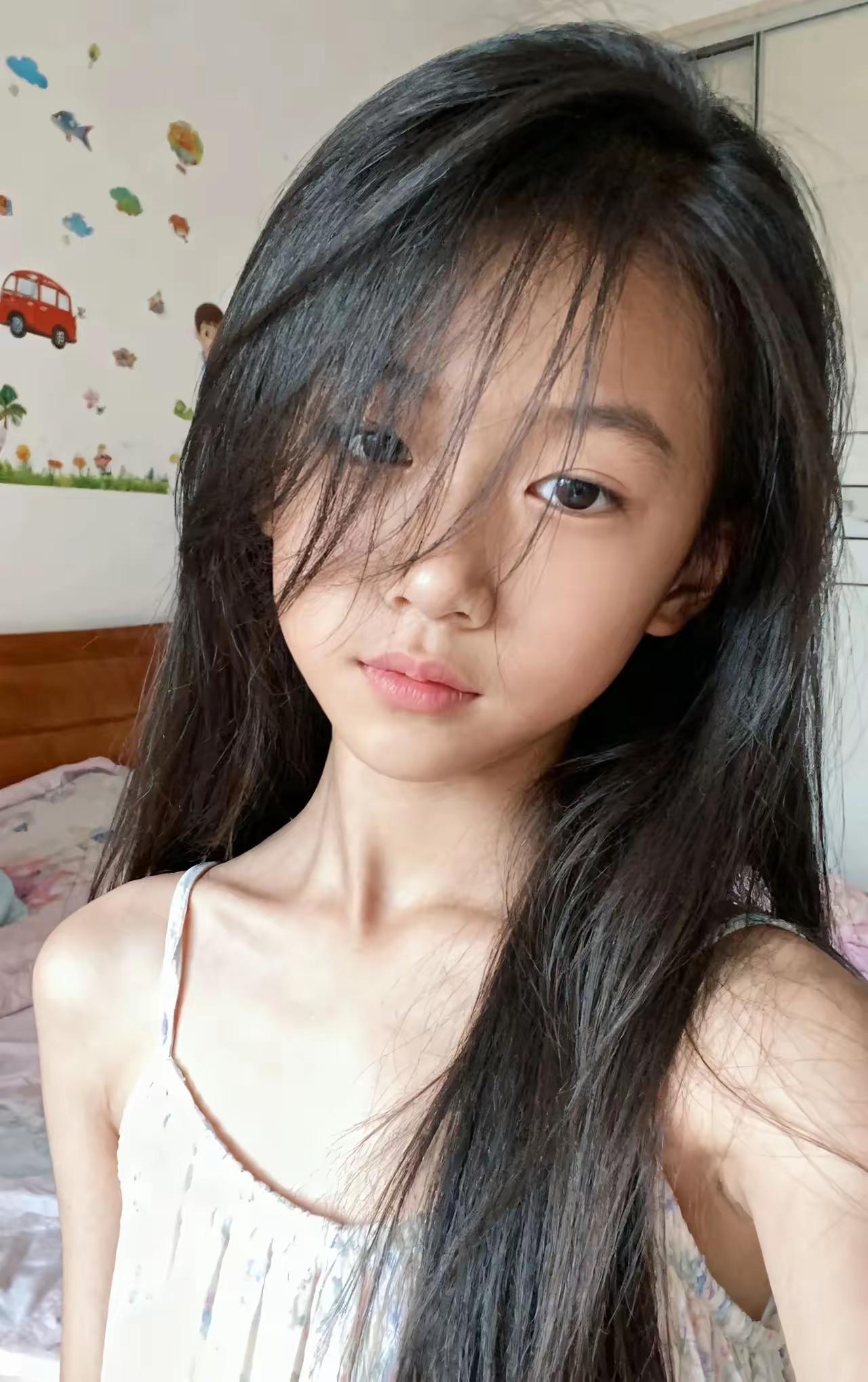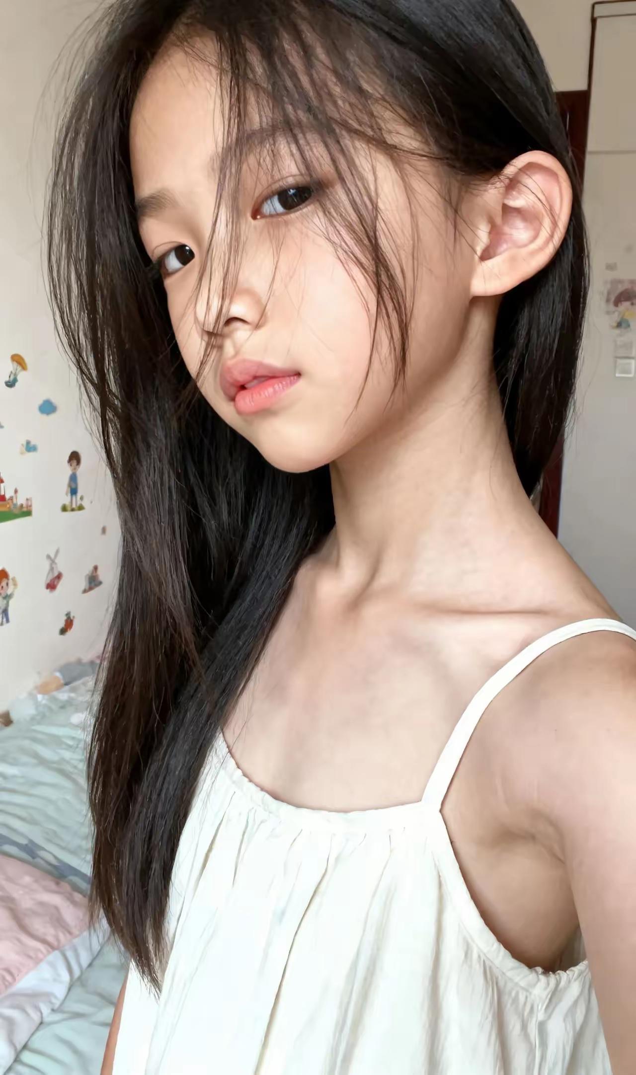 她站在贴满卡通贴的墙前,头发垂成自然的弧度,吊带裙的细肩带晃着细碎的光。 没有摆拍的僵硬,抬手自拍的角度刚好露出下颌线,光影在锁骨处裁出浅浅的阴影——这是只有私人空间才有的松弛,像把“日常”直接装进镜头里:发梢的乱、眼神的飘、裙摆的皱,都是少女感的注脚。 镜头不用追着风景跑,她本身,就是房间里最生动的景。