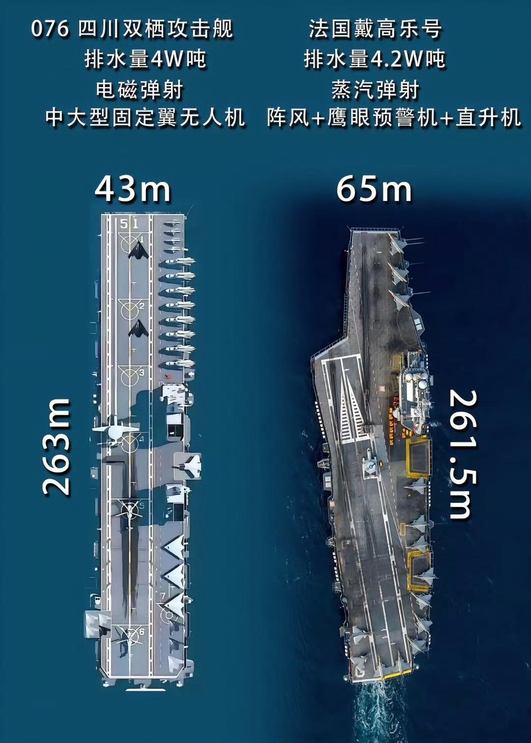 四川舰就是在扮猪吃虎 ! 排水量和法国的戴高乐基本上相当,关键还有更加先进的电磁弹射器,只是四川舰没有斜向的飞行甲板。 不过两艘舰艇的任务实实在是有很大的不同,因为四川舰的尾部是可以打开的状态,可以使两栖的舰艇通过尾部的甲板直接入海,参与两栖作战行动。 各位是怎么看的?欢迎评论区留言。