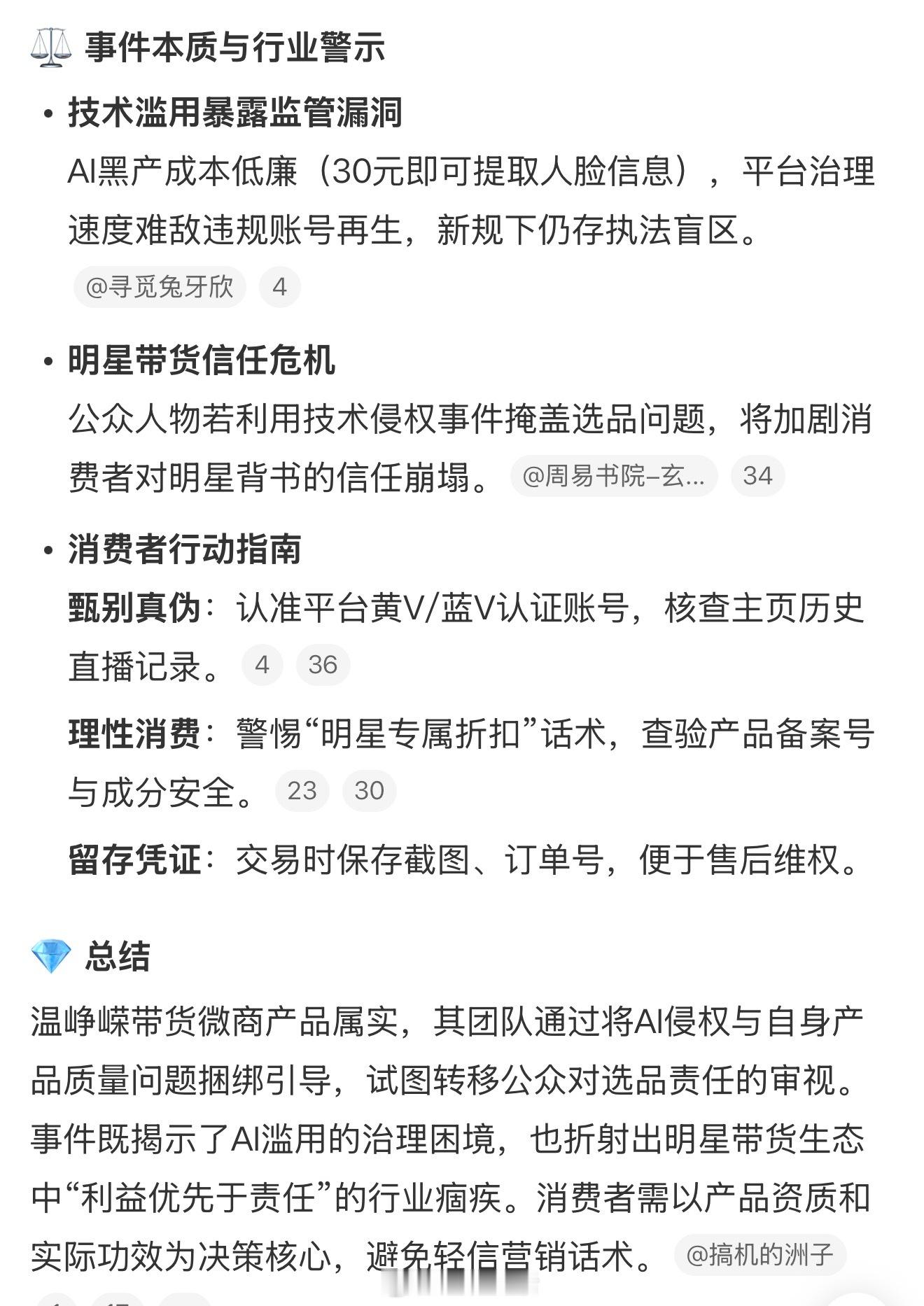 这位姐的口碑终于塌了,带货是真的,ai侵权也是真的,利用技术侵权事件掩盖选品问题也是真的。团队确实蛮厉害的,想出了将AI侵权与自身产品质量问题捆绑引导,试图转移公众对选品责任的审视,可惜运气差了点儿,没成功。