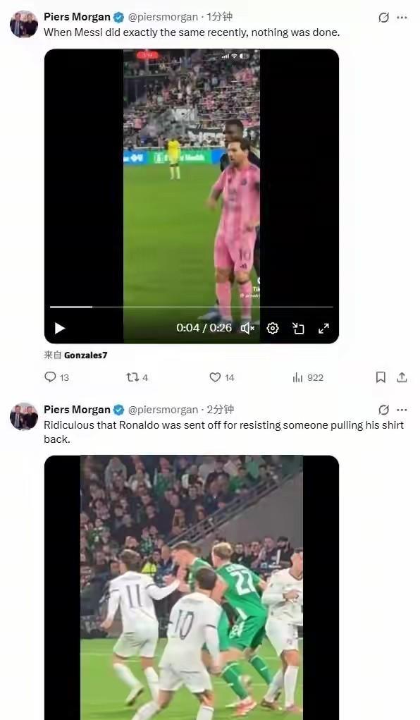 C罗:在禁区内转手肘击对方球员,导致对方球员倒地。主裁判本来判罚黄牌,VR裁判介入,改判红牌,C罗面临最多三场停赛处罚。 梅西:在禁区内争抢位置,确实有三次向后挥肘的动作,但是动作幅度不大,而且对方没有也没有倒地,所以梅西没有吃牌也正常。 不得不说,摩根采访C罗的视频网上爆火,所以摩根声援C罗也很正常。客观上说,C罗的动作确实比梅西大,而且梅西的对手不会演戏,没有顺势倒地。如果倒地,梅西也可能吃黄牌甚至红牌。 那么问题来了,C罗因为肘击对手吃了红牌,梅西三次肘击对手是不是也应该给牌?#梅西# #C罗#