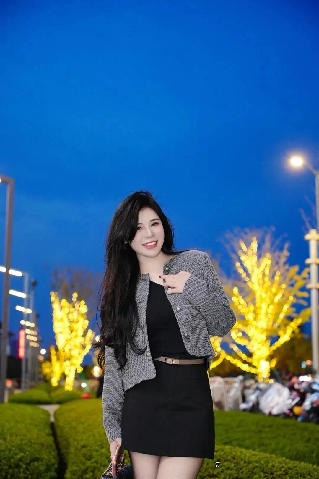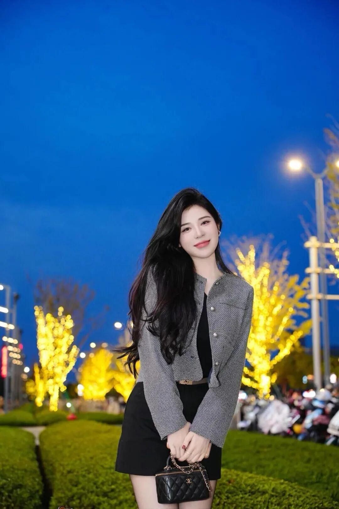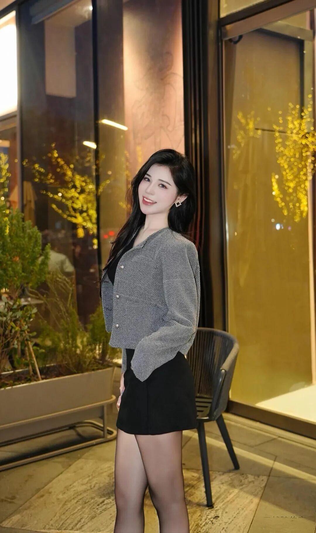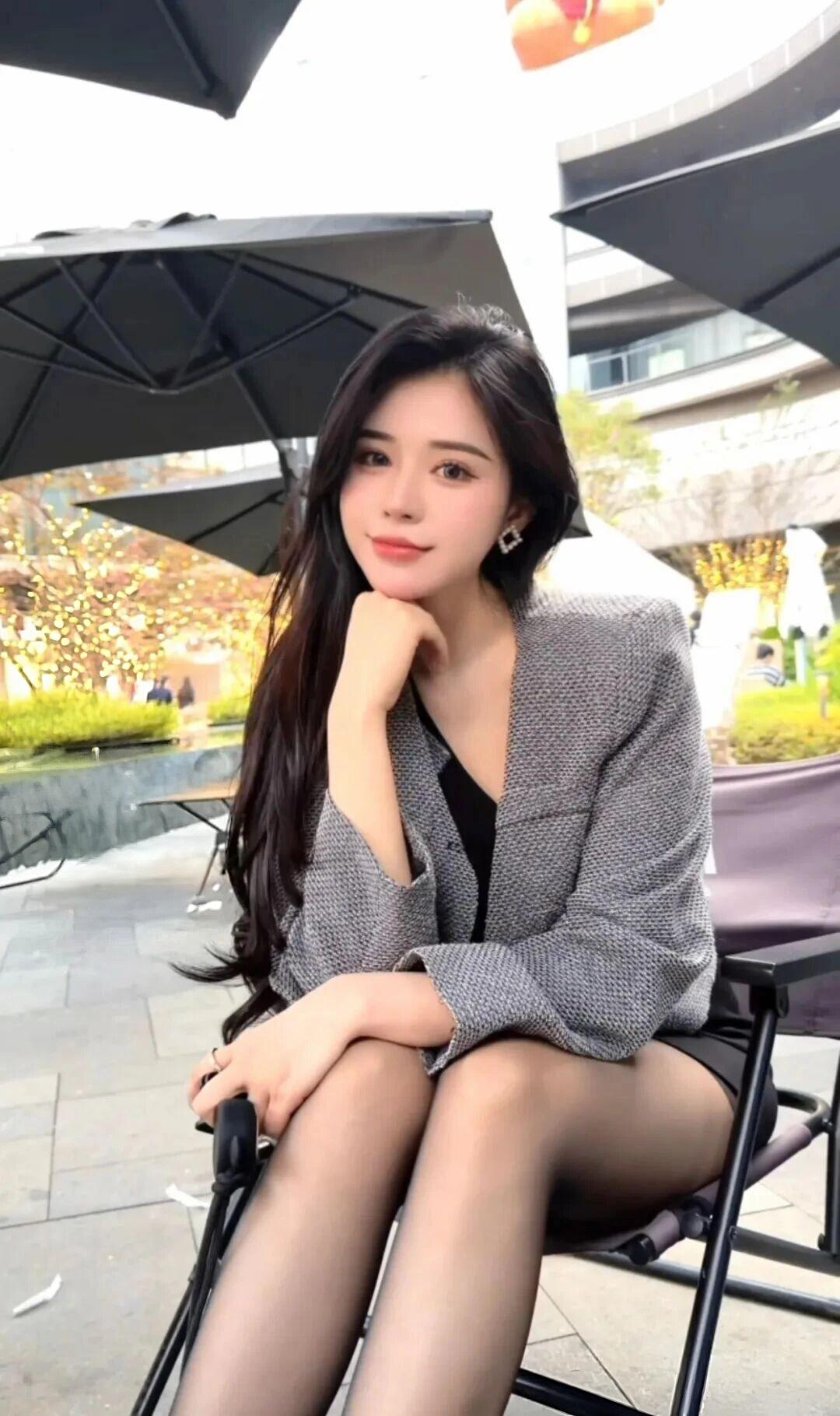 《秋日定格》 秋阳穿过黄栌叶的缝隙,在她灰色格纹西装上筛下细碎的光斑。她斜倚在藤编扶手椅里,黑色丝袜包裹的双腿交叠成利落的斜线,高跟鞋尖的银饰正巧接住一片飘落的枫叶,像别了枚天然胸针。 黑丝绒内搭的V领处垂着细链吊坠,坠子是个抽象的金色羽毛造型,在锁骨间投下流动的阴影。端着玻璃杯的右手微微倾斜,杯中气泡沿着杯壁攀爬,在阳光下炸开细小的彩虹。背景里的红漆铁艺架上,常春藤正顺着几何花纹蜿蜒,深绿叶片与远处枫林的绯红形成奇妙的色彩和弦。 椅脚边的碎石地面积着几片银杏叶,叶缘卷曲的弧度恰好呼应她微抿的唇角。当风掀起西装下摆时,露出内衬的丝绸里布,暗紫色纹理在瞬间的翻飞中惊鸿一瞥。她无名指上的玫瑰金戒指与杯壁凝霜相映,折射的光斑在格纹呢料上游移,仿佛整个秋天都成了她造型的调色盘。