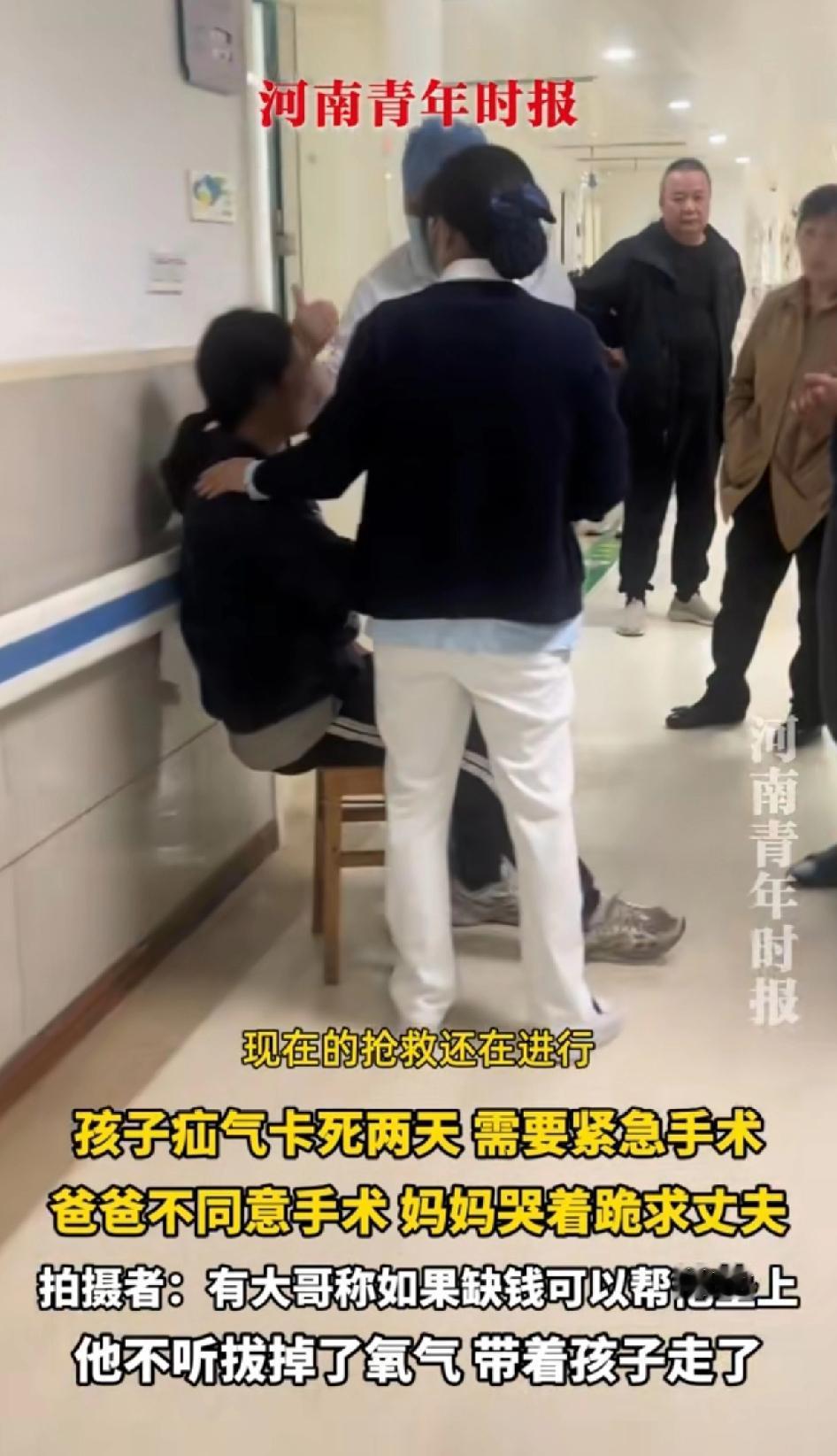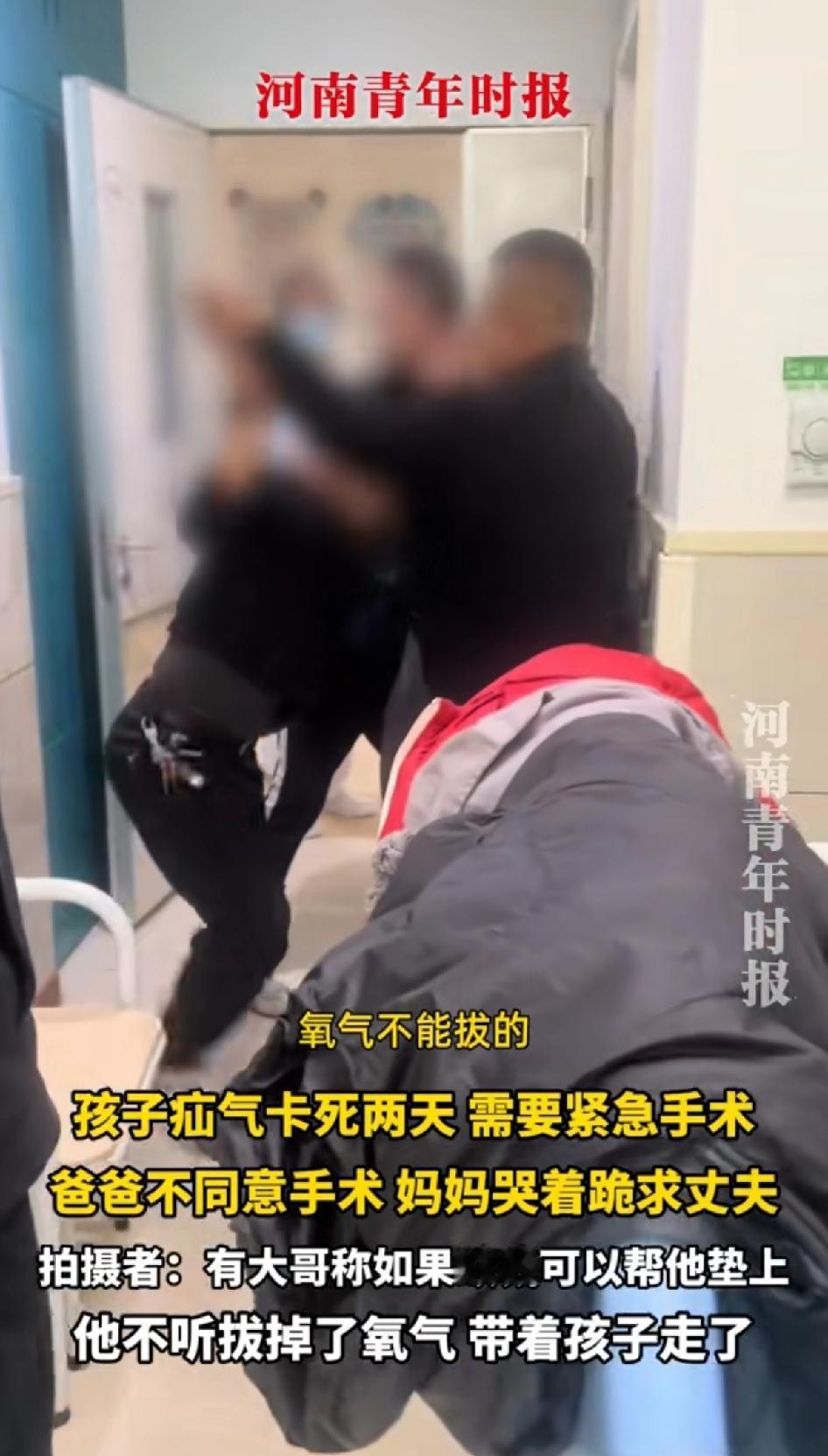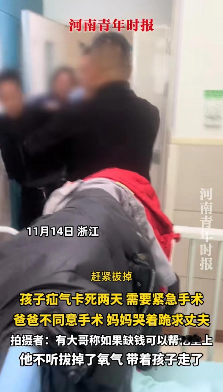 孩子疝气卡死两天 需要做紧急手术,爸爸不同意手术,妈妈哭着跪求丈夫。拍摄者称有大哥称如果缺钱,自己愿意替男子垫付医药费,男子不听执意拔掉了氧气,带着孩子走了。 浙江宁波一家医院里上演了令人窒息的一幕。一个五六岁的小男孩疝气卡死两天,疼得脸色发黄,医生明确必须立刻手术。 可孩子父亲死活不同意,他不信医院,偏信中医,觉得吃两副中药就行。孩子妈妈急得快崩溃,甚至当场给丈夫跪下祈求,都没用。 医生轮番劝说,强调嵌顿疝超过48小时孩子可能肠坏死,错过手术后果严重。 可这父亲质疑医院过度医疗,根本不听。有大哥看不过去,提出帮忙垫付手术钱。但最后他竟拔掉氧气,带着孩子走了。 想问问这种情况妈妈可以报警阻止该男子的行为吗?毕竟人命关天!孩子虽然是两个人的,但毕竟是妈妈冒着生命危险十月怀胎生下来的。 爸爸再爱孩子,也比不了妈妈对孩子的感情。 真不知道他咋想的,孩子的命可不能这么耽误啊! 如果后续有什么问题爸爸现在的行为是犯罪吗?