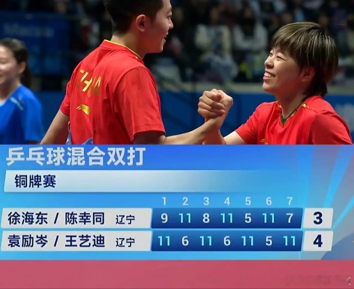 大逆转!诗与远方组合(广东队)获得乒乓球混双冠军 【金牌赛】蒯曼/陈垣宇2-4刘诗文/林高远年轻气盛的蒯曼陈垣宇组合,前两局敢打敢拼非常自信,两个人都打出来了速度和质量,14-12,11-8先下两城。诗与远方组合经验丰富,更加沉稳,尤其是第五局打得非常坚定,致使对手乱了方寸。8-11,8-11,8-11,10-12诗与远方连扳四局获得了最后胜利。【铜牌赛】王艺迪/袁励岑4-3陈幸同/徐海东