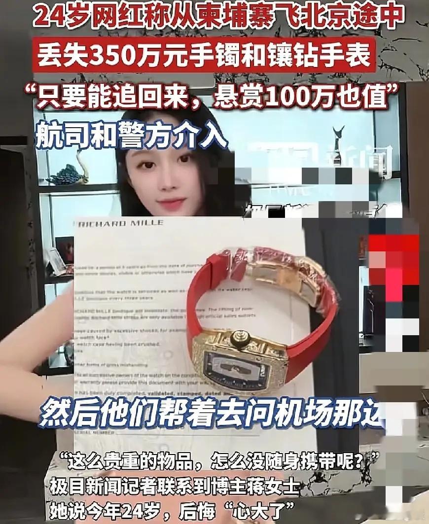 这下出名了吧大家都知道网红挣钱了24岁女网红坐飞机,托运350万首饰,落地只剩空盒子,直接悬赏100万寻线索!光看这数字,我都懵圈了。 据她所说,手镯是柬埔寨买的12万美元,理查德米勒镶钻手表花了260万港币,俩宝贝才买没多久就丢了。 她飞的是柬埔寨金边到北京的航班,查了首都机场监控没毛病,推测问题出在金边机场,还有当地网友说这是惯犯操作。 网红有钱买奢侈品是本事,但把百万贵重物品随便托运,也太没安全意识了,真的是钱多烧的慌。 虽然知道你不是在炫富,但是也给大家提了个醒,国际托运的时候一定要谨慎再谨慎,因为你不知道到底有多少坑在等你。 你们坐飞机时,会把值钱东西托运吗?评论区说说你的避坑经验~