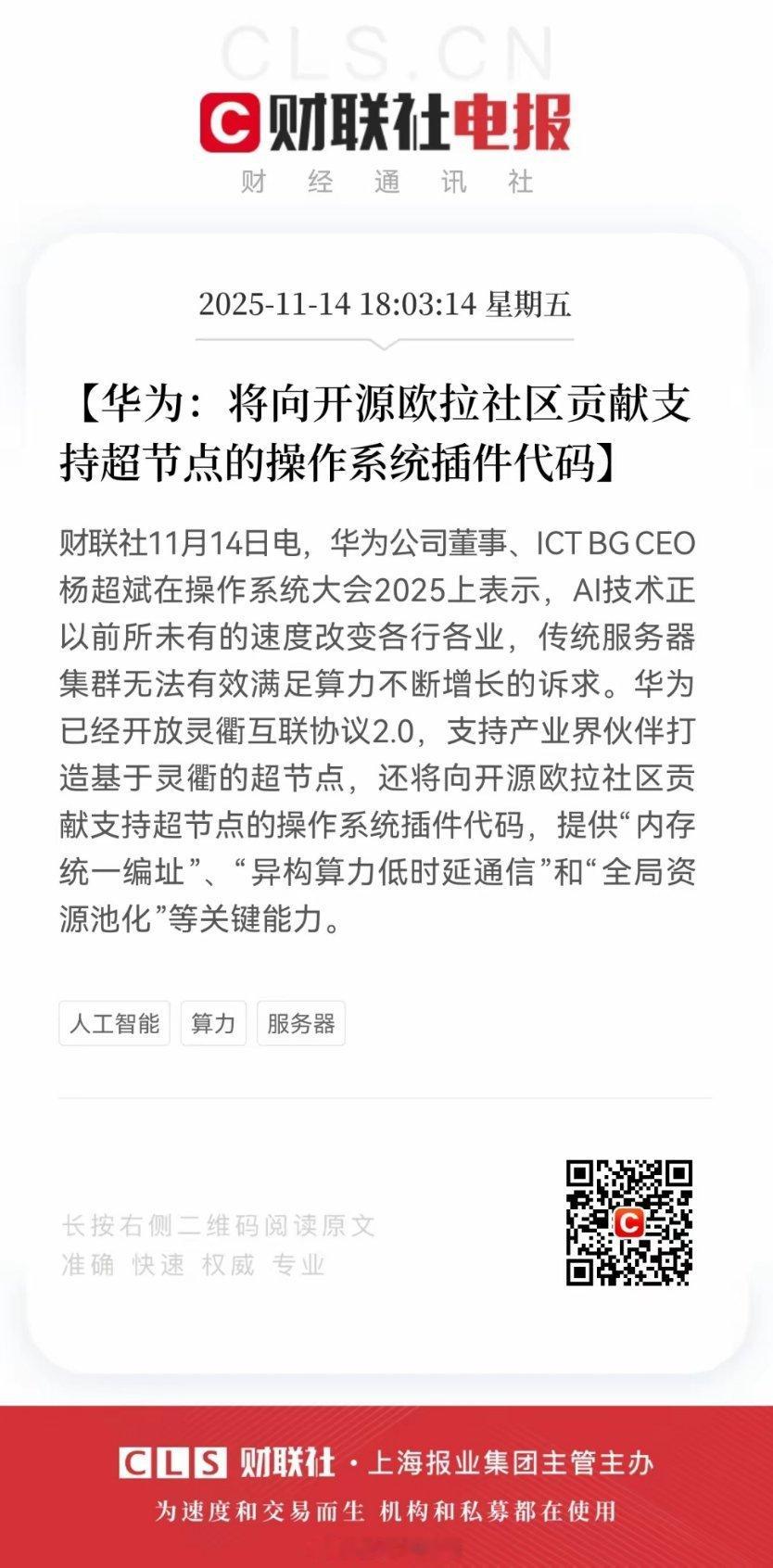特大利好!特大利好!华为今天又放了个大招,开源欧拉社区捐超节点的操作系统插件代码,对AI算力圈来说,等于给“算力不够用”的难题开了个药方。现在AI数据中心越建越多,传统服务器集群根本扛不住暴涨的算力需求。华为这波操作,是把灵衢互联协议2.0开放了,简单说就是把一堆服务器拧成一个“超级节点”,算力能统筹着用,效率直接拉满。对行业的影响很实在:欧拉是国内服务器操作系统的主力,华为捐代码等于把超节点的能力“开源化”,产业链伙伴不用自己从头研发,直接就能基于欧拉做高算力方案。这不仅能加速国内AI算力基础设施的升级,还能让华为的灵衢生态更快铺开。对投资来说,欧拉产业链的企业(比如做服务器操作系统、算力调度的)可能会跟着受益,毕竟底层能力升级了,上层应用的空间也更大了。这波操作算是华为在算力基建里的“生态布局”,既帮行业解决了实际问题,也把自己的技术优势转化成了生态优势。以下是欧拉生态相关的核心上市公司清单:1. 诚迈科技(300598)国内欧拉操作系统核心合作伙伴,深度参与欧拉社区开发,提供基于欧拉的操作系统定制、迁移服务,是华为开源生态的重要参与者。2. 麒麟软件(未上市,关联标的:中国软件600536)中国软件旗下麒麟软件是欧拉生态核心厂商,推出了基于欧拉的服务器操作系统,与华为在算力基础设施领域有深度合作。3. 拓维信息(002261)依托华为昇腾生态,布局基于欧拉的服务器操作系统适配业务,同时参与超节点相关的算力调度方案研发。4. 润和软件(300339)欧拉社区的重要贡献者之一,提供欧拉操作系统的适配、开发工具链等服务,与华为在开源生态领域合作紧密。5. 东方通(300379)其中间件产品已完成与欧拉操作系统的兼容适配,可依托欧拉生态拓展企业级算力应用场景。最后提醒:以上内容不构成任何推荐建议,投资有风险,入市需谨慎。