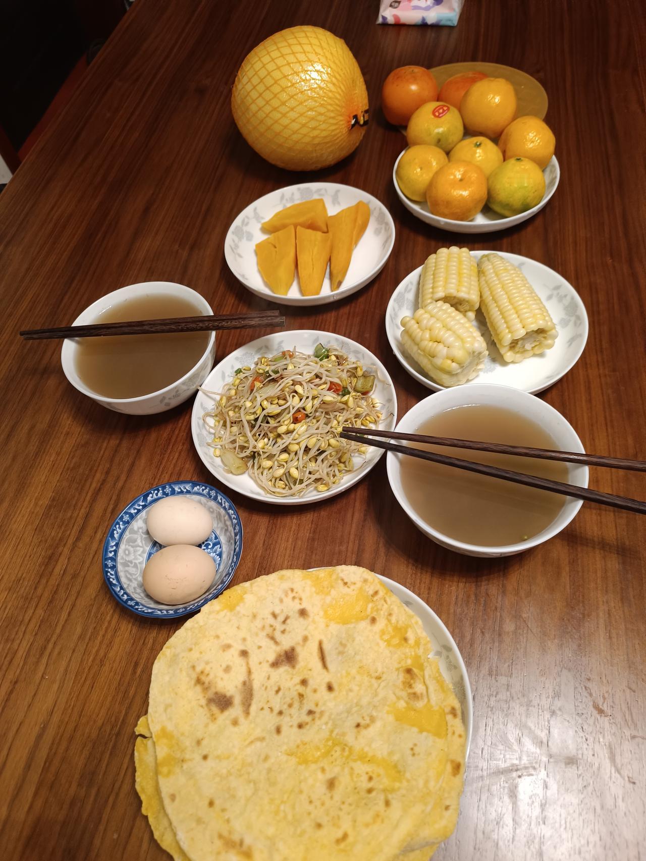 今天早上做两人餐,先把绿豆稀饭做上,蒸了一根红薯,一个粘玉米,炒了一盘黄豆芽,还