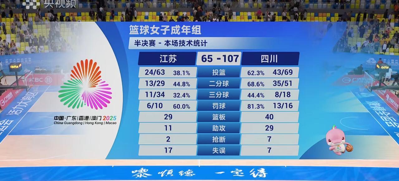 全运女篮半决赛太精彩了,四川队107比65大胜江苏队,直接打进决赛。比赛从第一节就一边倒,四川队39 - 19领先,早早让比赛失去悬念。 四川队众将发挥出色,韩旭21分9板,李缘16分,李梦和王思雨也都有两位数得分,而且十二人轮换全员得分。江苏队张曼曼拿下19分算表现不错。 接下来四川队将和广东队会师决赛,这也是WCBA总决赛对决的延续。广东队小组赛三战全胜,淘汰赛也顺利晋级,但阵容厚度不如四川。不过她们主场作战且曾在WCBA击败过四川,陈明伶在内线的表现很关键,这场决赛很值得期待! 四川女篮演技 女篮四省精英赛 川苏女篮