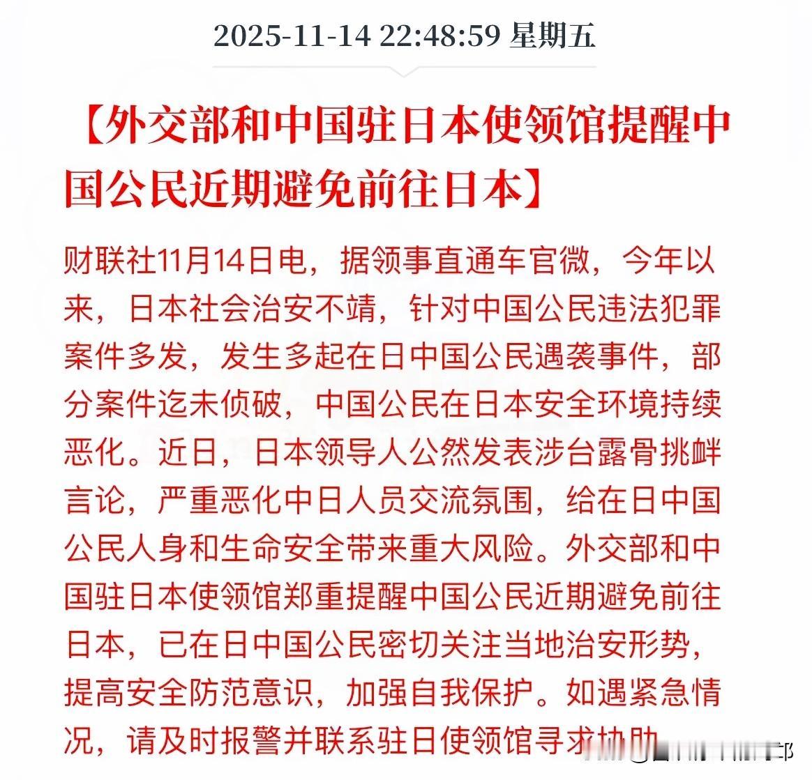 中日建交以来最严赴日提醒 直接把日本右翼的野心扒得底朝天!这哪是简单的安全警示,分明是中方撕破脸的清醒告知:别再拿“口无遮拦”当借口,你们的小心思早被看穿了! 高市早苗喊着“台海是日本存亡危机”,还暗示要动武介入,那可不是随口瞎说。这是日本政坛右翼憋了好久的心里话,只不过以前藏着掖着,现在被她直白喊了出来。她多次参拜靖国神社、否认历史,背后是整个日本保守势力想突破和平宪法、搞军事扩张的共同诉求。 所谓民族复兴的“三件大事”,根本不是狭隘的对抗,而是守护民族根本利益的必然。统一是底线,台湾问题是中国内政,容不得任何外部势力指手画脚;清算历史不是复仇,而是要让日本正视侵略罪责,杜绝军国主义死灰复燃;所谓决战,是面对干涉者的底线思维——你敢越线,我就敢亮剑。 这三件事看似针对不同场景,核心对手其实是同一个:那些试图阻碍中国统一、歪曲历史、破坏地区和平的势力。中方的赴日提醒,不是恐慌,而是提前划清红线:别把中国的克制当软弱,任何触碰核心利益的行为,都得付出代价。 现在的中国早就不是任人拿捏的年代,我们既要坚定维护主权,也绝不主动挑事,但更不怕事。这波提醒既是给在日公民的安全保障,也是给日本右翼的严正警告。你觉得日本右翼的野心能得逞吗?来评论区聊聊~