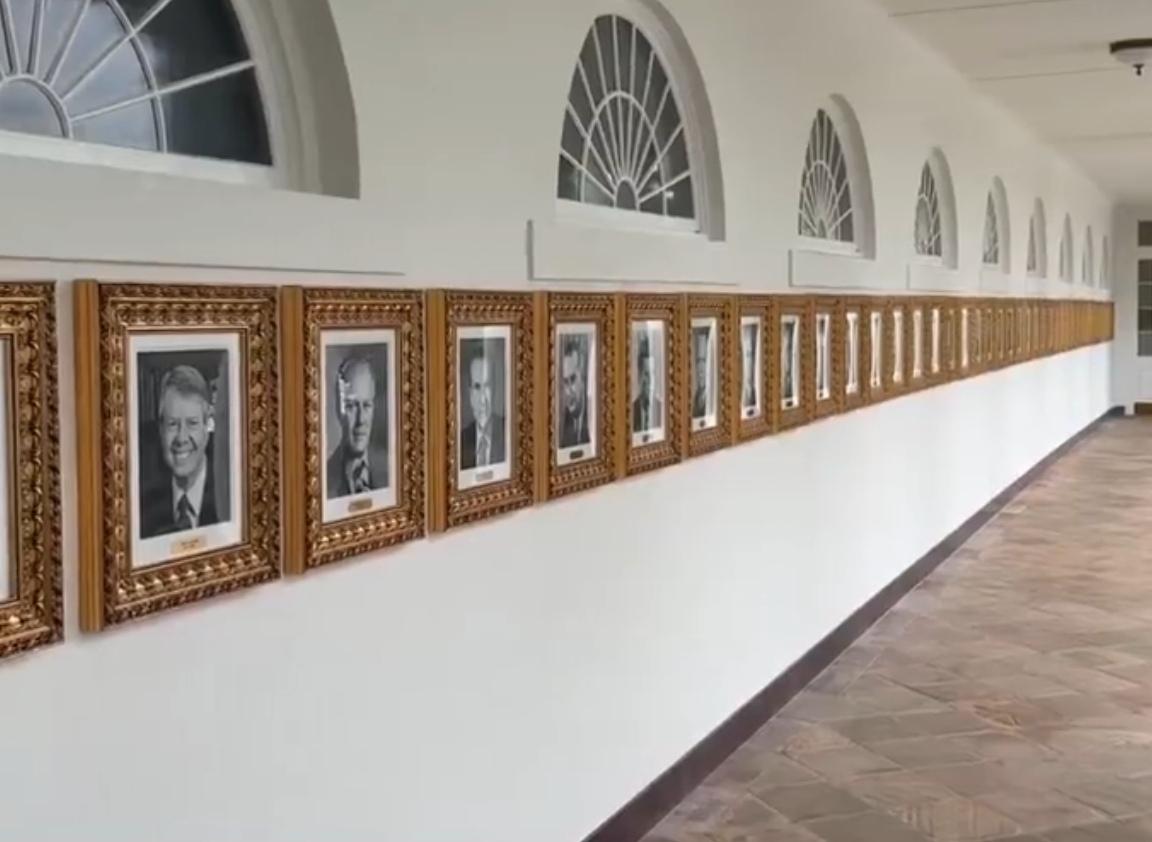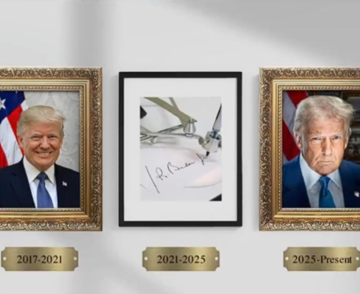 特朗普又干了件大事!这招太绝了! 白宫“总统名人墙”沦为特朗普的荒诞闹剧场:他将自己两任肖像夹着一张自动签名笔照片,以此对拜登实施“政治除名”之举。这位曾痛斥用自动笔签署赦免令“可耻”的政客,转眼就忘了自己也曾用它签署文件,还嘴硬称“只签不重要的”。 从对“瞌睡乔”进行人身污蔑,到把总统肖像墙当作攻讦工具,特朗普所谓的“较量”毫无底线。拜登早已澄清决策均为亲自作出,可他却偏要凭借毫无根据的指控来炒作噱头。将白宫这一圣地沦为党争闹剧的舞台,这哪里是在嘲讽对手,分明是暴露了他输不起的狭隘心态与双重标准。
