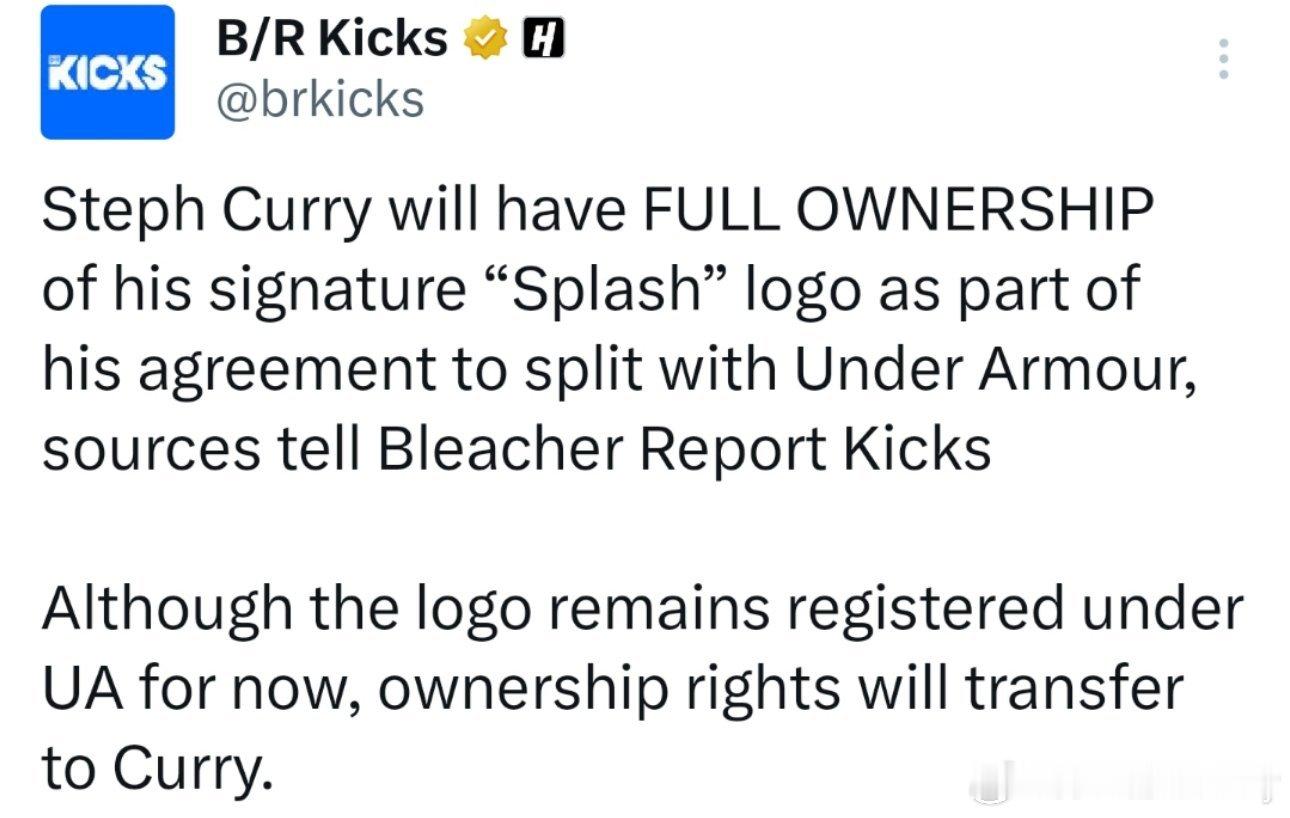 据报道,库里与安德玛解约协议中的一项内容是,他将完全拥有其标志性LOGO——SPLASH的所有权。目前,该LOGO仍注册在UA旗下,但最终所有权会转移给库里。