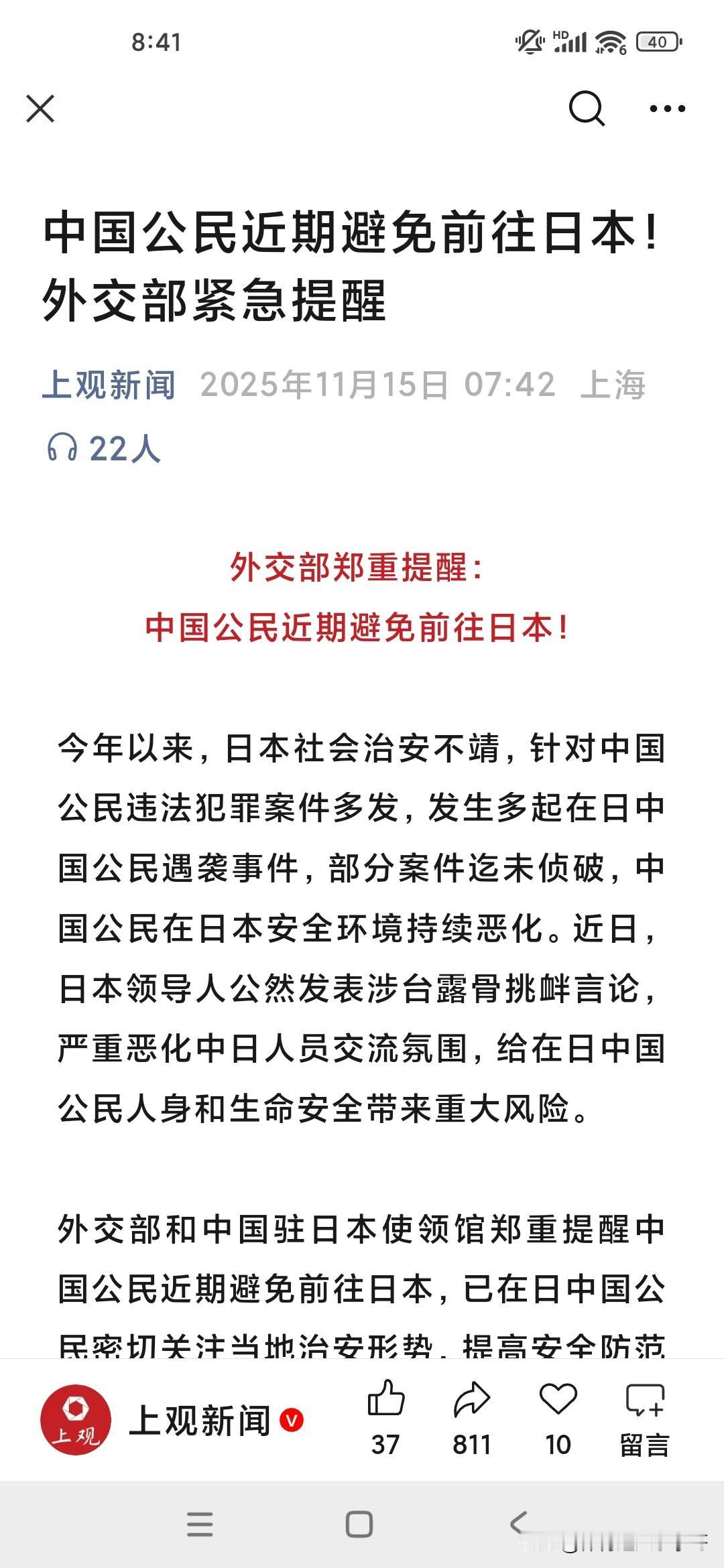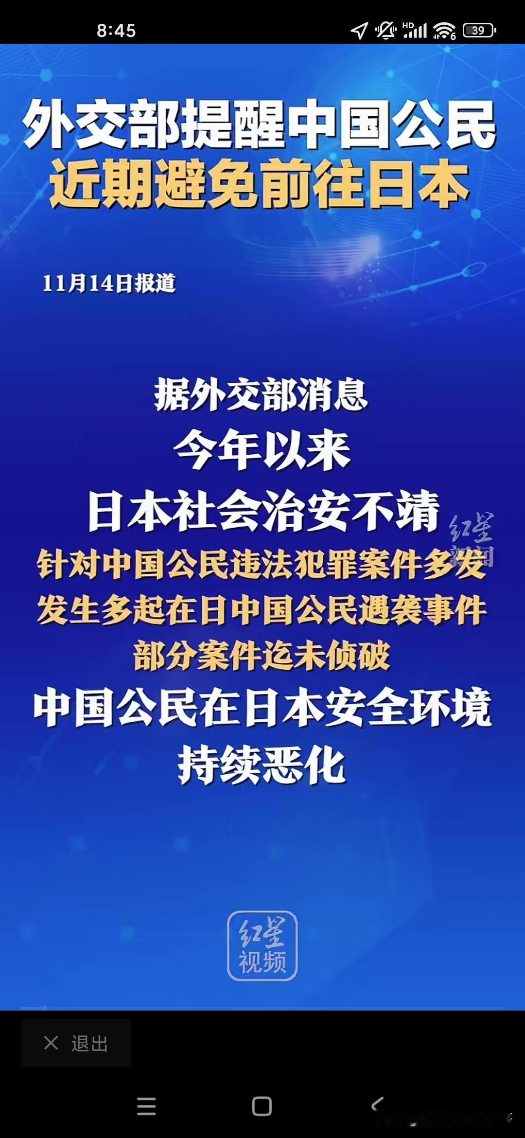 我的一个学生家长非常喜欢日本文化,他经常去日本,但是最近我们中国驻日大使以及中国外交部就提醒现在日本的一些右翼势力包括军国主义,他们时刻盯着中国人,极有可能会绑架伤害啊,抢劫啊,一些日本人对于在日本的中国游客不友好,甚至会袭击中国人,他们的情绪日趋高涨,因为中国已经对日本进行了对等的反击,所以说他们提醒不必要不要前往日本,因为现在日本的民众中有一些人还是喜欢铤而走险的,有些人总是想要制造事端,日本有这样的传统,在1895年的时候,曾经刺杀过前往日本签订马关条约的李鸿章,以前日本对于中国游客进行过刺伤啊,绑架的也大有人在,所以说大家的话去日本的话一定要注意,我还提醒这位家长朋友说最近非必要不要去日本了,因为中日关系有点紧张!