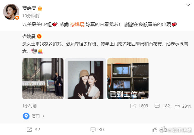 贾静雯回复姚晨:以美最美CP组!感動姚晨前往福建探班正在拍摄新剧的贾静雯,两人因合作医疗剧《以美之名》戏外延续了剧中乔杨周静雯“相爱相杀”的默契友谊长存。