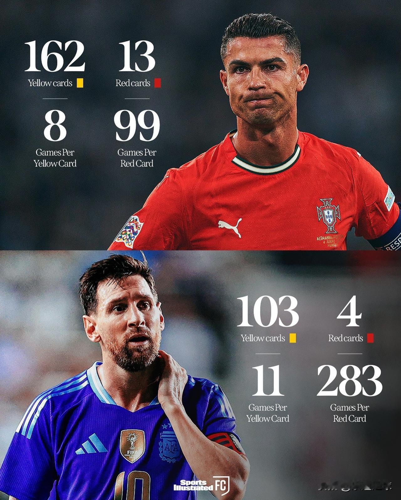 梅西和C罗在职业生涯中均有过红黄牌记录,但两人的风格和判罚情况常引发讨论。 C罗在2025年11月14日的比赛中领到其代表葡萄牙国家队出战226场以来的第一张红牌,成为焦点事件。 相比之下,梅西职业生涯中吃到的红牌也较少,图片通过对比梅西、C罗数据,直观呈现了两位足坛巨星的获牌情况: 【核心数据对比】 ▌ C罗(上) - 红黄牌总数:162黄 / 13红 • 场均黄牌:每8场获1张黄牌 • 场均红牌:每99场获1张红牌 ▌梅西(下) - 红黄牌总数:103黄 / 4红 • 场均黄牌:每11场获1张黄牌 • 场均红牌:每283场获1张红牌