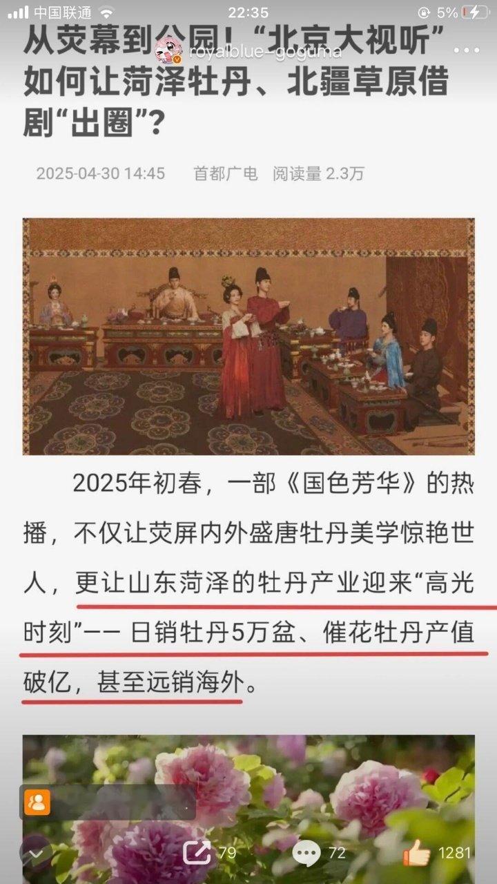 《国色芳华》广电和山东官方双双认证,杨紫李现演绎的盛唐美学刷屏出圈。带火了菏泽牡丹,文创订单翻倍涨,文化赋能产业妥妥的范本!