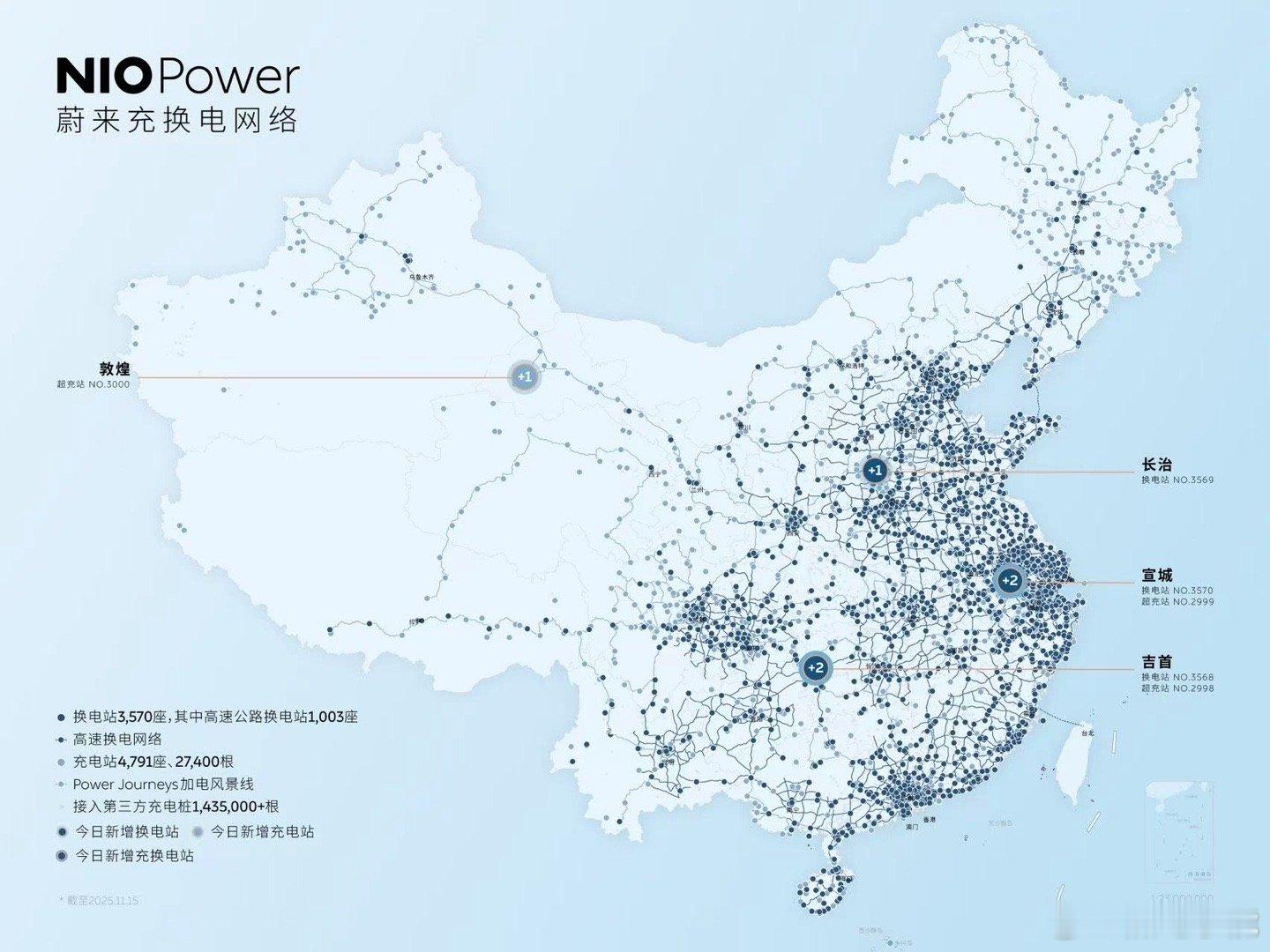 11月15日 NIO Power 6站上线NO.3568 蔚来换电站|湘西吉首乾城大道NO.3569 蔚来换电站 | 长治淮海公园NO.3570 蔚来换电站 | 宣城郎溪中港NO.2998 蔚来超充站|湘西吉首乾城大道NO.2999 蔚来超充站 | 宣城郎溪中港NO.3000 蔚来超充站 | 敦煌敢曼万达文华酒店