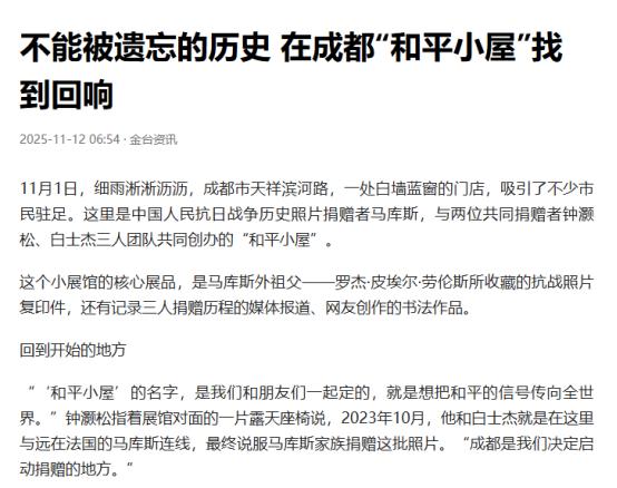什么情况? 向中国捐赠日军侵华相册的法国小伙马库斯11月12日发视频向社会寻求帮助 !   11月12号,法国小伙马库斯在社交平台发了条求助视频,这个小伙子之前无偿给中国捐过日军侵华的历史照片。   视频里的马库斯脸上面倦色很明显,说话时透着一股焦急劲儿,他把自己和伙伴们碰到的麻烦跟关注他的网友全说了,这番话很快就在网上传开,引来了好多人的关注。   大部分网友都听过马库斯这个名字,大家对他印象深,全是因为一批珍贵的日军侵华历史照片。   马库斯的外祖父叫罗杰·皮埃尔·劳伦斯,以前在上海生活过,那时候就用相机拍下了淞沪会战这些日军侵华的真实场面。2021年整理外祖父车库时,马库斯意外翻出了这批老照片。弄明白照片里记录的是多么沉重的历史后,他就有了把照片捐给中国的想法。   为了让这批照片能得到专业的保存和展示,马库斯认识了钟灏松和白士杰两个中国伙伴,三个人凑成一个团队,开始推进捐赠的事儿。   2024年4月,他们先在社交平台发了第一条视频,让更多人知道了这批照片的存在;2025年2月,几个人带着照片飞到北京,把照片送到上海淞沪抗战纪念馆做鉴定;到了同年8月4日,三人在巴黎的中国驻法大使馆,正式把这批照片无偿捐了出去。整个捐赠前后花了快三年,马库斯为这事儿来回跑了好几趟中法两国,搭进去不少时间和精力。   捐完照片后,三个人商量着在成都弄个“和平小屋”,他们想把这批照片的复印件和捐赠过程中的事儿都展示出来,让更多人能通过这些实物了解历史,把和平的想法传出去。   成都对他们三个人来说意义不一般——钟灏松是土生土长的成都娃,白士杰在成都工作生活了8年,早把这儿当成了“第二故乡”。而且在2023年10月,钟灏松和白士杰就是在成都跟远在法国的马库斯视频连线,最后才说通马库斯一家同意捐照片的。   2025年11月1号,位于成都市天祥滨河路的“和平小屋”正式开门了,这间白墙蓝窗的小店没多久就吸引了不少市民停下脚步。小屋里最核心的展品,除了马库斯外祖父留下的抗战照片复印件,还有记录他们三个人捐赠经历的媒体报道剪报,以及网友写的书法作品。   钟灏松之前说过选在锦江边的原因,他觉得那些带着沉重历史记忆的照片,得找个舒服放松的地方放着,来参观的人能在慢悠悠的氛围里,更清楚地明白照片背后那些艰难的岁月。   可和平小屋的运营并没像预想的那么顺利。马库斯在视频里说,小屋开门还没到一个星期,就被陌生人恶意破坏了好几次。   他在视频里晒了现场照片,照片里能看到小屋的玻璃门有明显的划痕,门口的宣传展板被推倒在地上,展板上印着的历史照片被弄脏弄破了好几处,有些展品的框架也变了形。   这些破坏行为让三个人心里特别难受,他们花心思布置的展示场景全被搅乱了。   没过多久,一个自称是“自律委员会”的杨某找到了马库斯。杨某跟马库斯提了个要求,让他和伙伴们每个月给这个组织交一笔钱,说是“管理费”。马库斯当场就问这笔钱收的依据是什么、要用到哪儿去,可杨某根本说不出合理的解释,就只强调这是“组织的规定”。   马库斯明确表示,这笔钱既没有法律依据,也没有书面凭证,就是不合理的收费,他不能答应这个要求。   被拒绝后,杨某直接跟马库斯放了狠话。杨某告诉马库斯,如果他不按时交钱,就会让和平小屋开不下去。   马库斯对杨某的威胁特别生气,他觉得自己和伙伴们开和平小屋就是纯粹的公益事儿,一分钱商业利润都没有,杨某这种做法分明就是在拦着公益事业往前走。   为了保住自己的权益,让小屋能正常开下去,马库斯和钟灏松、白士杰三个人先后报了四次警,跟警察详细说了小屋被破坏和杨某威胁收费的情况。警察接到报警后也查了、调解了,可没起到什么实际作用,搞破坏的人到底是谁一直没查到,杨某的威胁也没被制止住。   更过分的是,马库斯说除了杨某,还有个自称是这个自律委员会成员的贾女士,她直接参与了破坏小屋的事儿,事后既不赔钱道歉,甚至都不配合相关部门的调解。   为了处理这些事,马库斯特意从法国飞回成都,白士杰也从泰国赶了回来。三个人本来计划把所有精力都放在和平小屋的运营和历史宣传上,现在却不得不把大量时间花在应对破坏和维权上。   在好几次维权都没结果、杨某的威胁还一直存在的情况下,马库斯才决定发视频向社会求助。